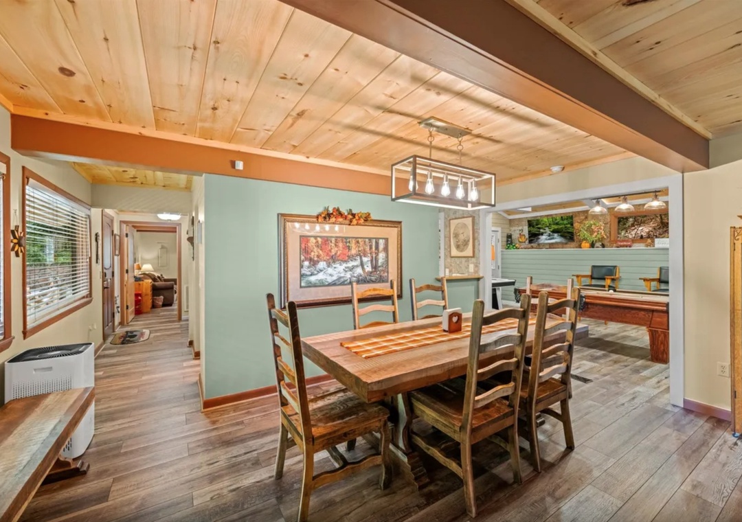 Gather around the farmhouse-style dining table, featuring classic ladder-back seating for six and warm overhead lighting. It’s the perfect spot for shared meals, board games, or arts and crafts after a day of adventure.