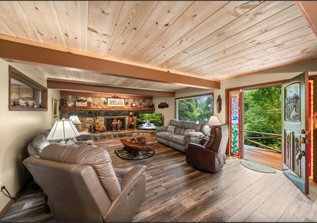 Vaulted ceilings, shiplap walls, and a Smoky Mountain mural