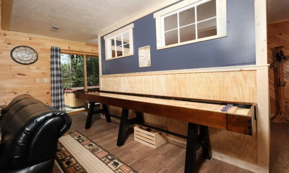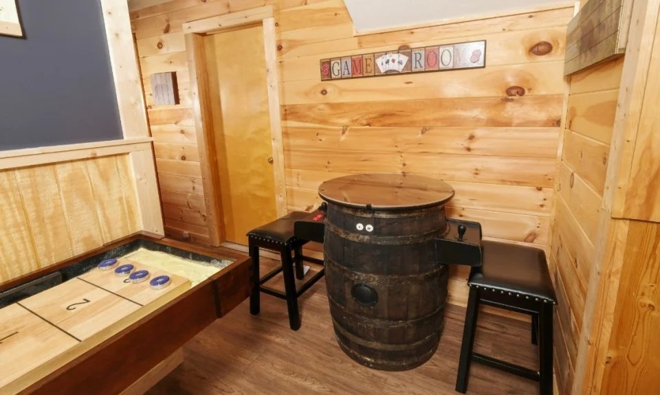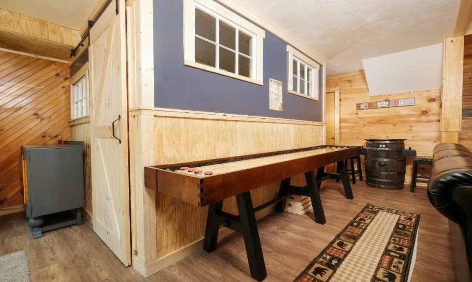 Game room with shuffleboard and arcade