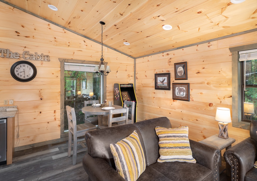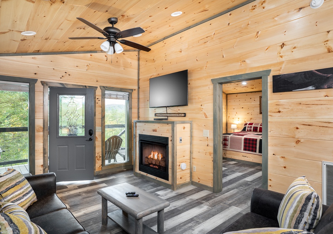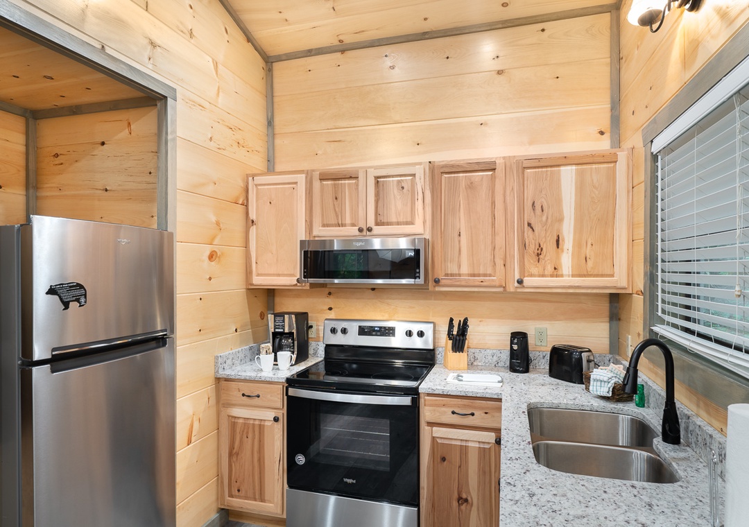 Beautiful full kitchen with stainless appliances and granite countertops. Fun to prep meals and snacks in your very own cabin in the mountains. You'll have everything you need to prepare a 4 course dinner or just enjoy vacation snacks. Living room is beautifully furnished with comfy furniture and plenty of room. Gas fireplace for atmosphere and to take that East Tennessee chill off. Curl up and relax. Tell some stories, play cards or catch the game. 55" TV. Maybe you have a good book or a favorite tv show. It's your vacation - enjoy every moment.