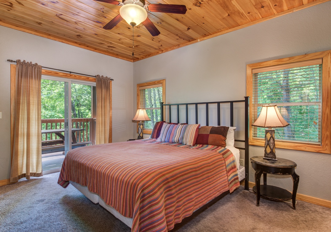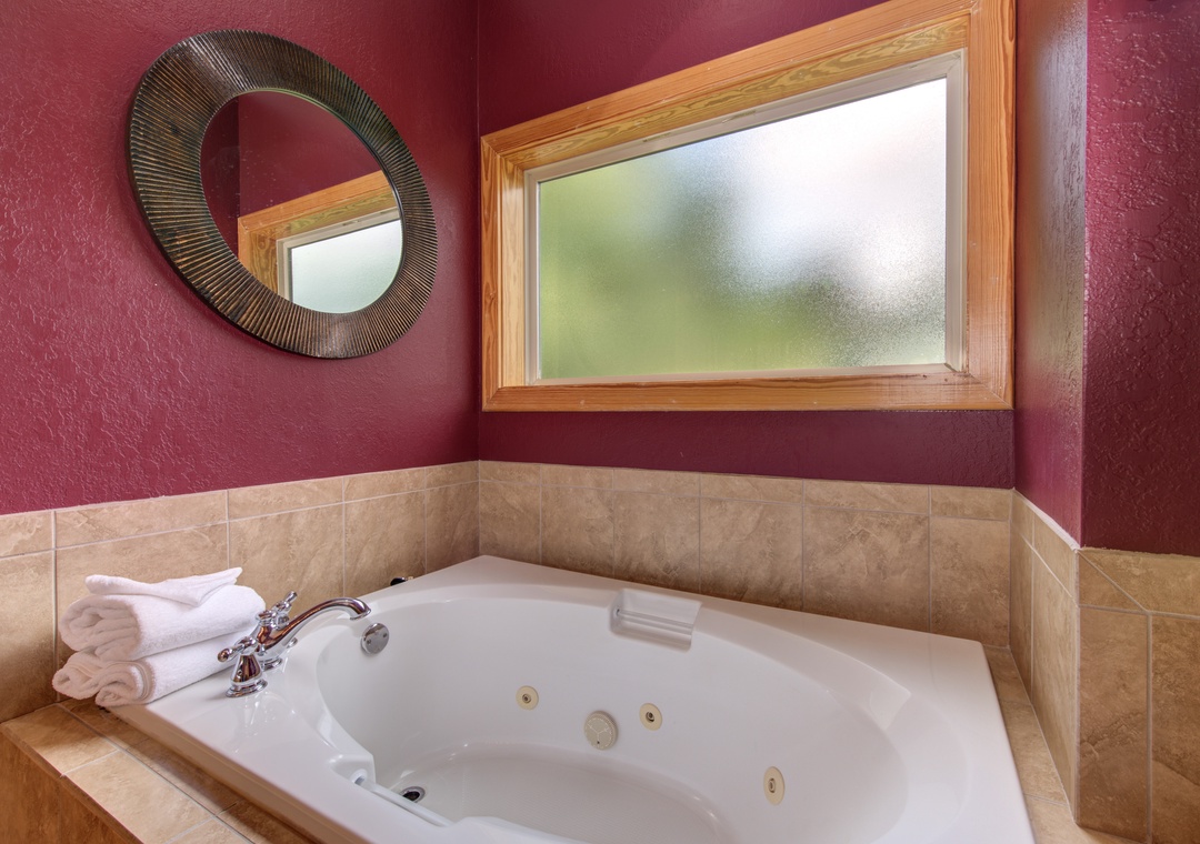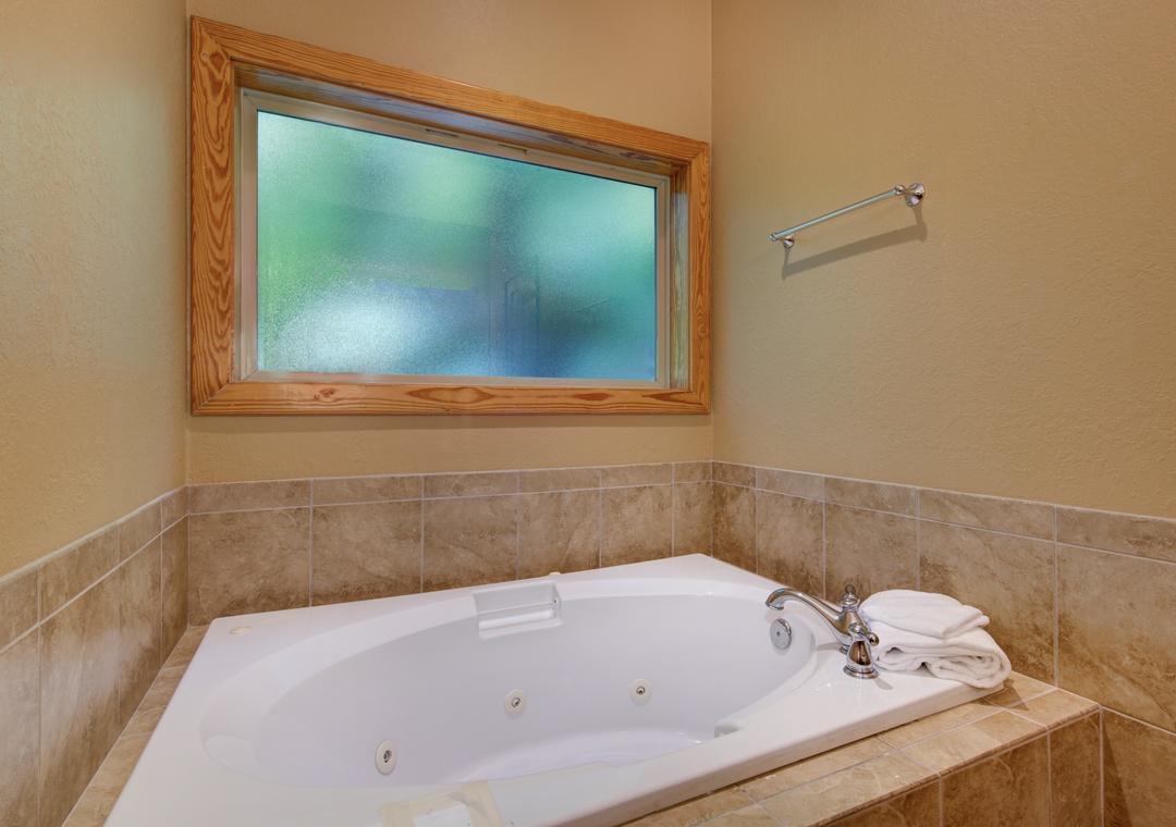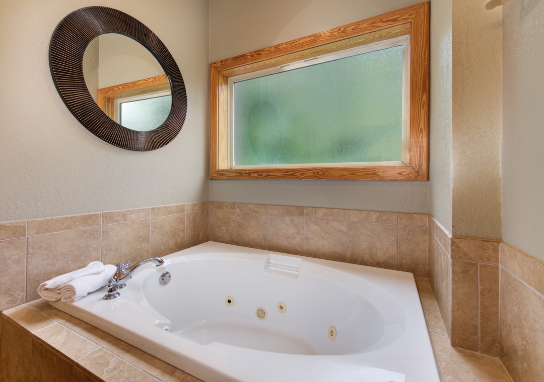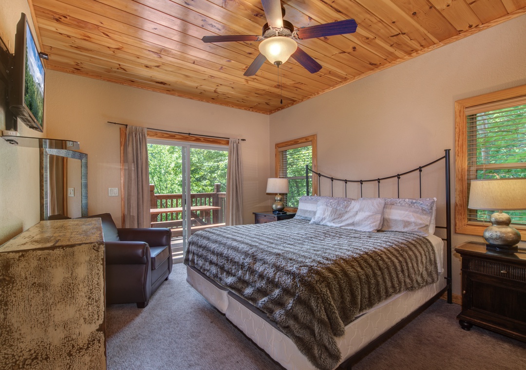 • Master Bedroom: on the main level w/ King Bed, 33” Cable TV, Ensuite Bath w/ Jacuzzi Tub & Shower, Balcony Access w/ Outdoor Seating
