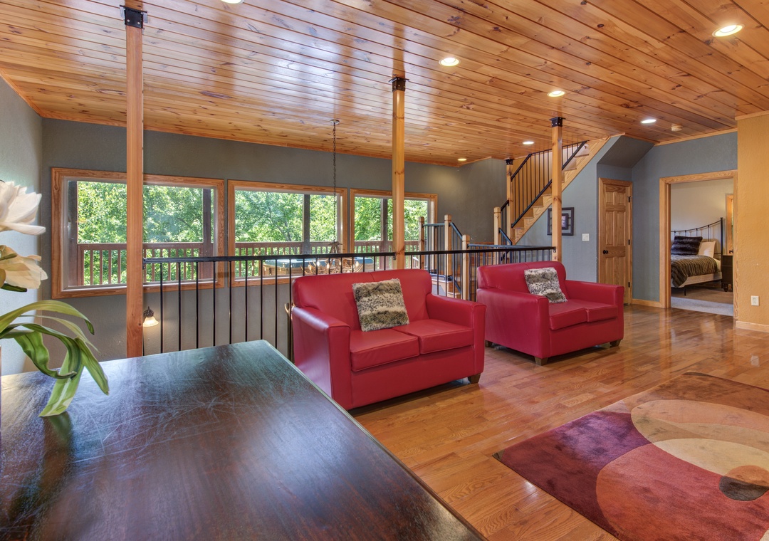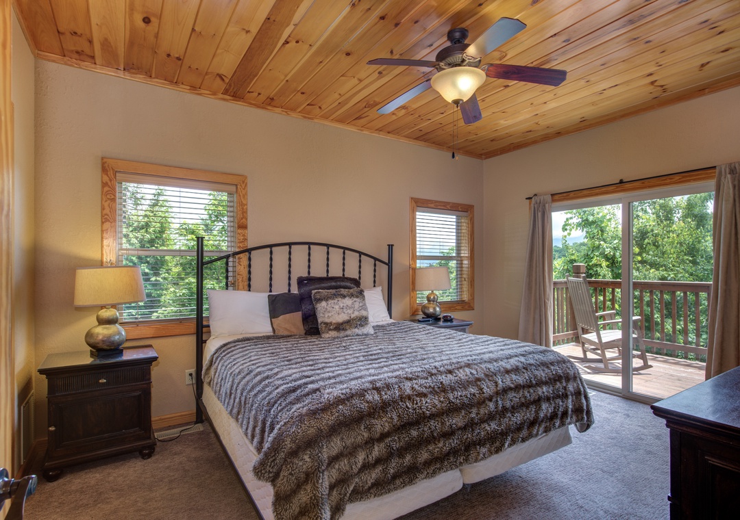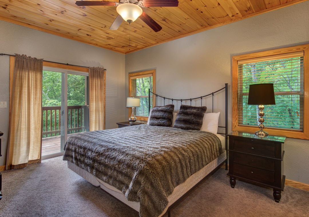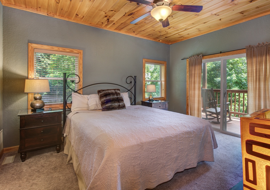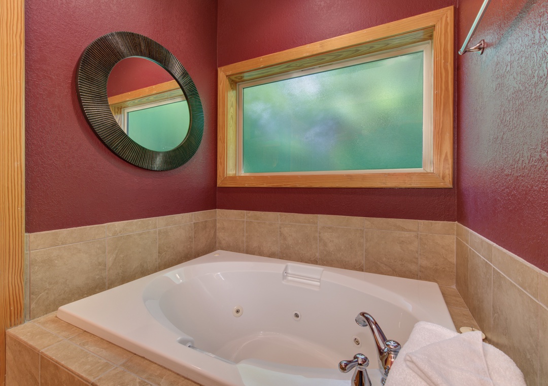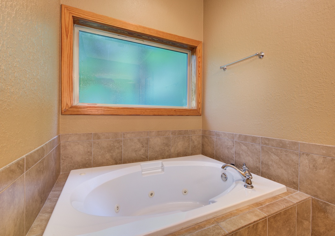 • Master Bedroom: on the main level w/ King Bed, 33” Cable TV, Ensuite Bath w/ Jacuzzi Tub & Shower, Balcony Access w/ Outdoor Seating