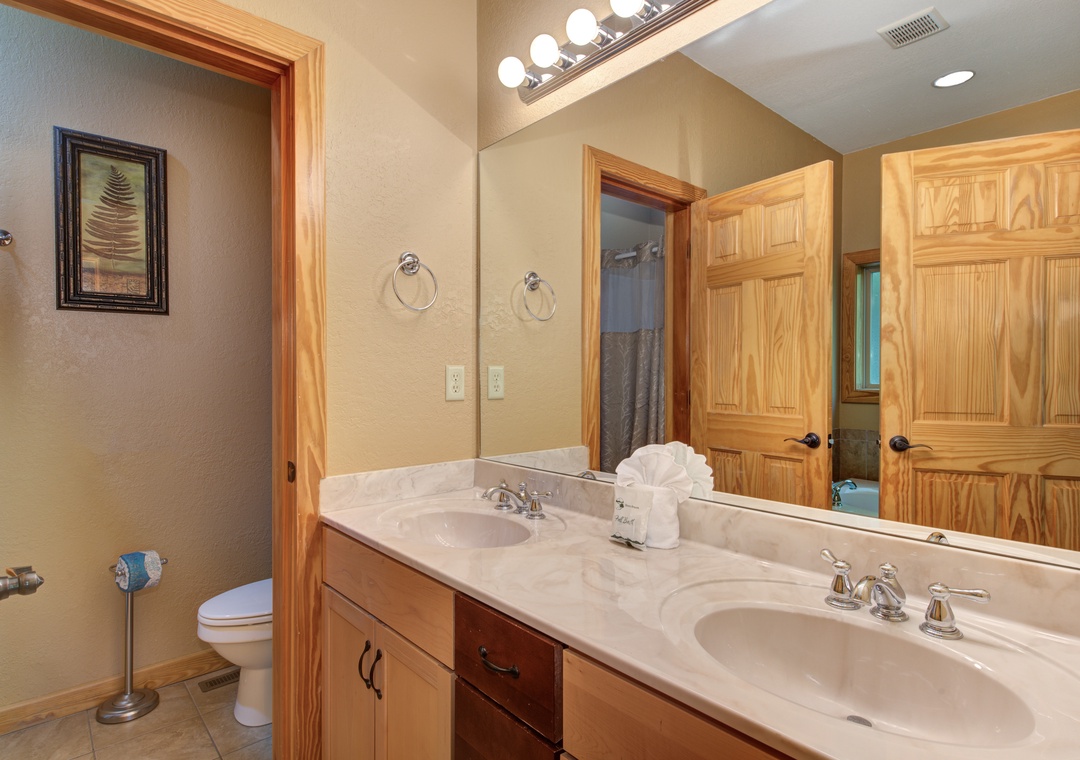 • 5th Bedroom: on the lower level w/ King Bed, 33” Cable TV, Ensuite Bath w/ Jacuzzi/Shower Combo, Balcony Access w/ Outdoor Seating