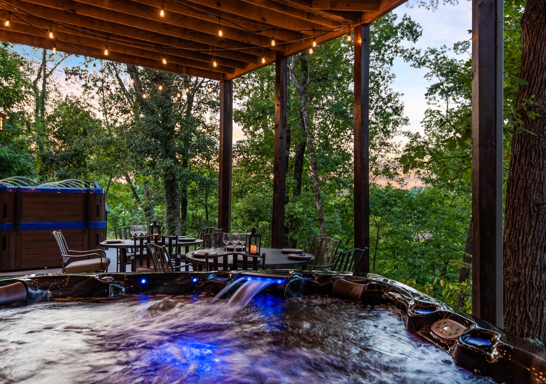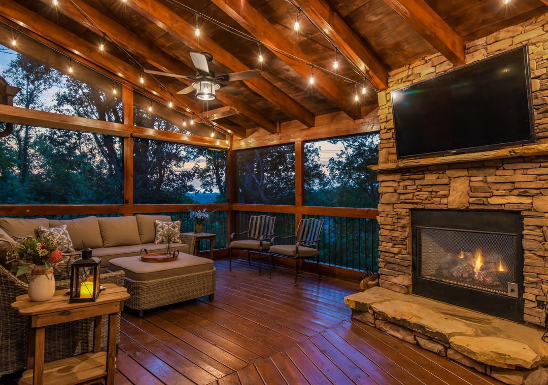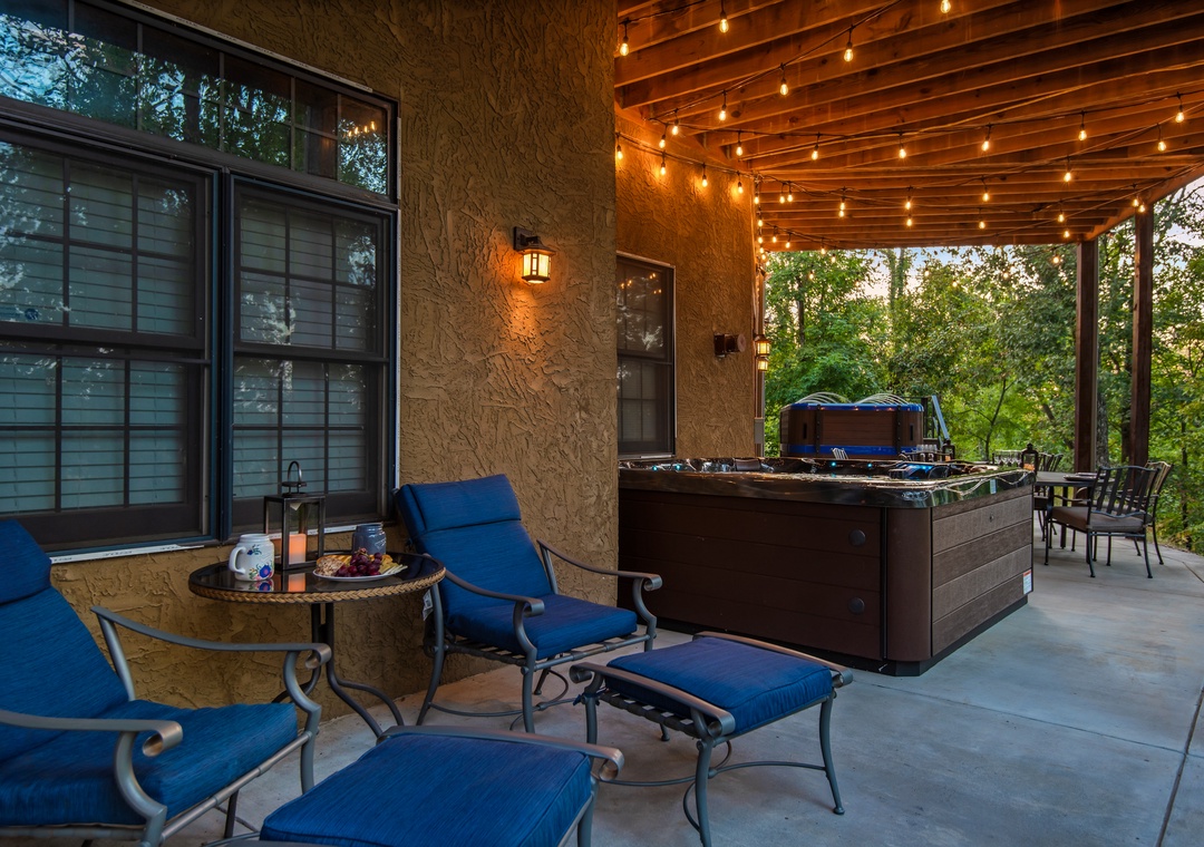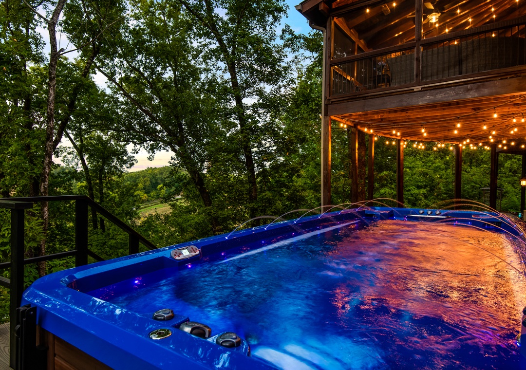 The back deck contains a huge 25 ft. screened in porch with wrap around couches, 6 person round dining table, and beautiful stacked stone gas fireplace with a TV over it. Surrounded by trees this is a wonderful place to watch the sunset as you spend time with family and friends. Or perhaps to enjoy drinking coffee in the morning while listening to and watching the birds jump from branch to branch. Also on this deck is a covered dining area with a table that seats 12 and a huge gas grill. What a great place to gather and enjoy one another. On the deck below is a beautiful 17 foot swim spa pool with many features. Surrounded by waterfalls and LED lighting this pool is simply stunning. You can be the early bird and enjoy doing your laps against the current before the day begins or take the kids for a group swim and enjoy the lazy river setting, water fountains, and LED light show. Or ….you might want to just relax with friends. It really offers something for everyone - year round. And, of course, you can lock it so the little ones can't get in without you. We all want your kids safe and enjoying the pool with parents to supervise. This deck also offers lounge chairs, a dining table, and a beautiful hot tub. Hanging LED lights make for a fun and relaxing atmosphere. This is a great place to spend time with friends and family.