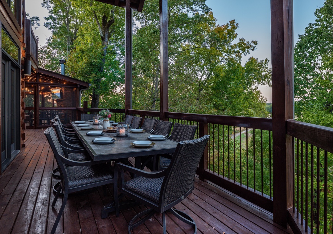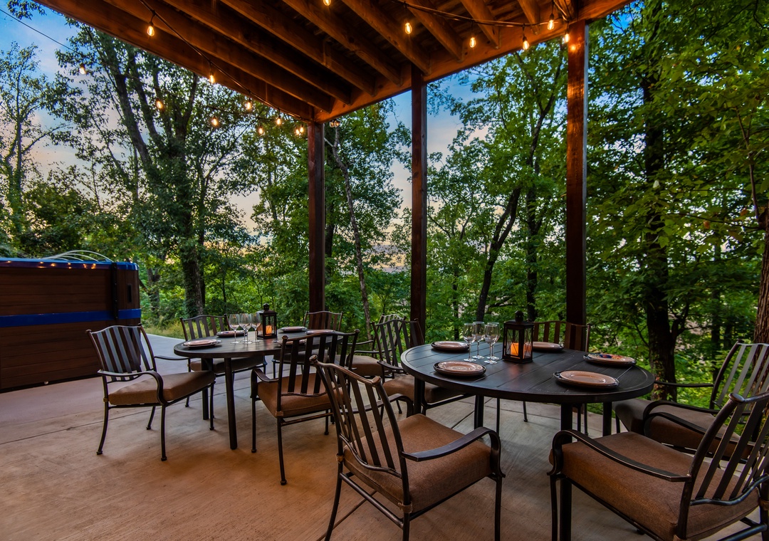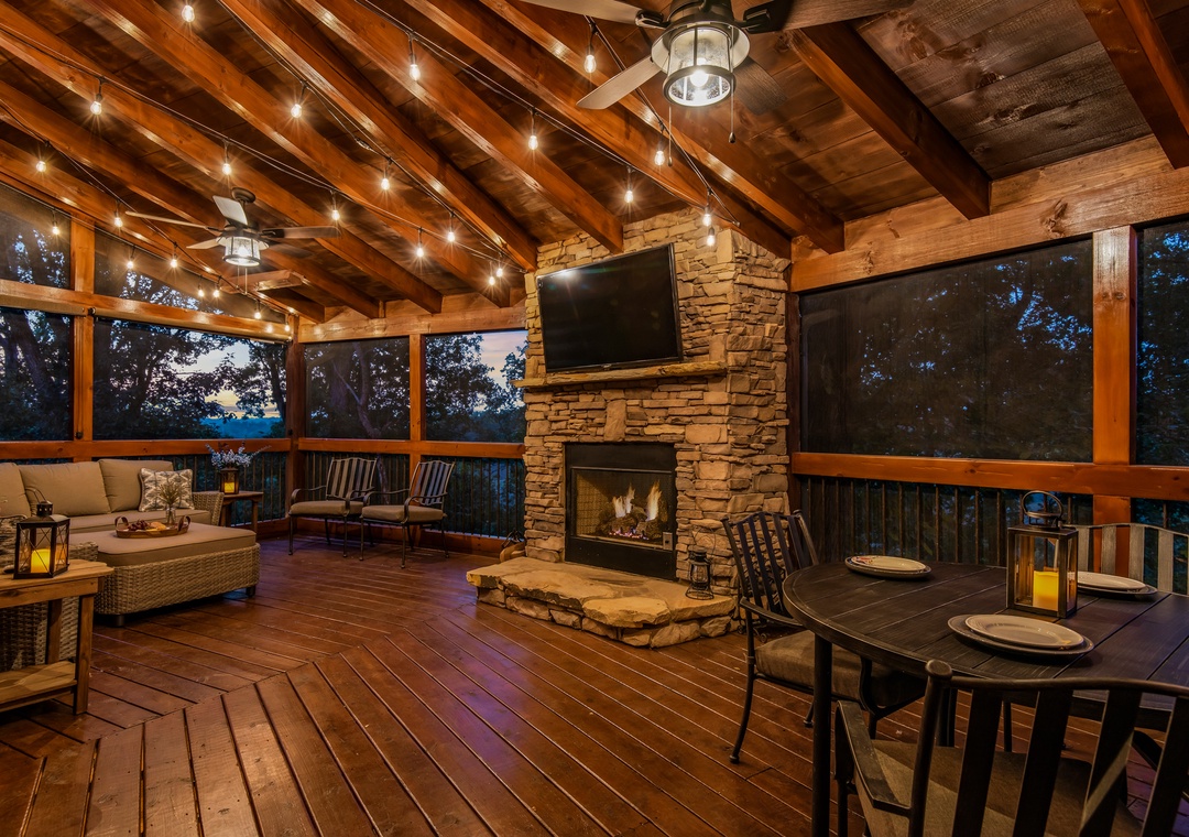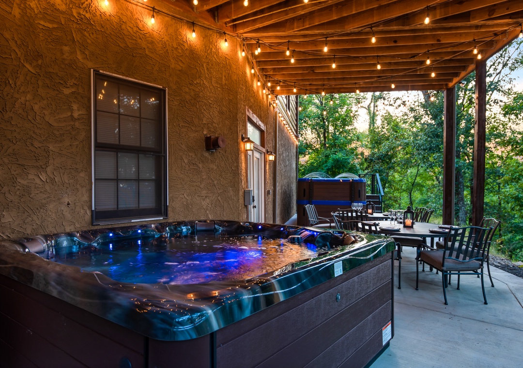 The back deck contains a huge 25 ft. screened in porch with wrap around couches, 6 person round dining table, and beautiful stacked stone gas fireplace with a TV over it. Surrounded by trees this is a wonderful place to watch the sunset as you spend time with family and friends. Or perhaps to enjoy drinking coffee in the morning while listening to and watching the birds jump from branch to branch. Also on this deck is a covered dining area with a table that seats 12 and a huge gas grill. What a great place to gather and enjoy one another. On the deck below is a beautiful 17 foot swim spa pool with many features. Surrounded by waterfalls and LED lighting this pool is simply stunning. You can be the early bird and enjoy doing your laps against the current before the day begins or take the kids for a group swim and enjoy the lazy river setting, water fountains, and LED light show. Or ….you might want to just relax with friends. It really offers something for everyone - year round. And, of course, you can lock it so the little ones can't get in without you. We all want your kids safe and enjoying the pool with parents to supervise. This deck also offers lounge chairs, a dining table, and a beautiful hot tub. Hanging LED lights make for a fun and relaxing atmosphere. This is a great place to spend time with friends and family.