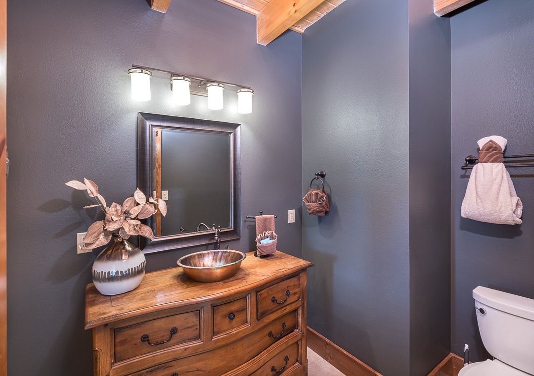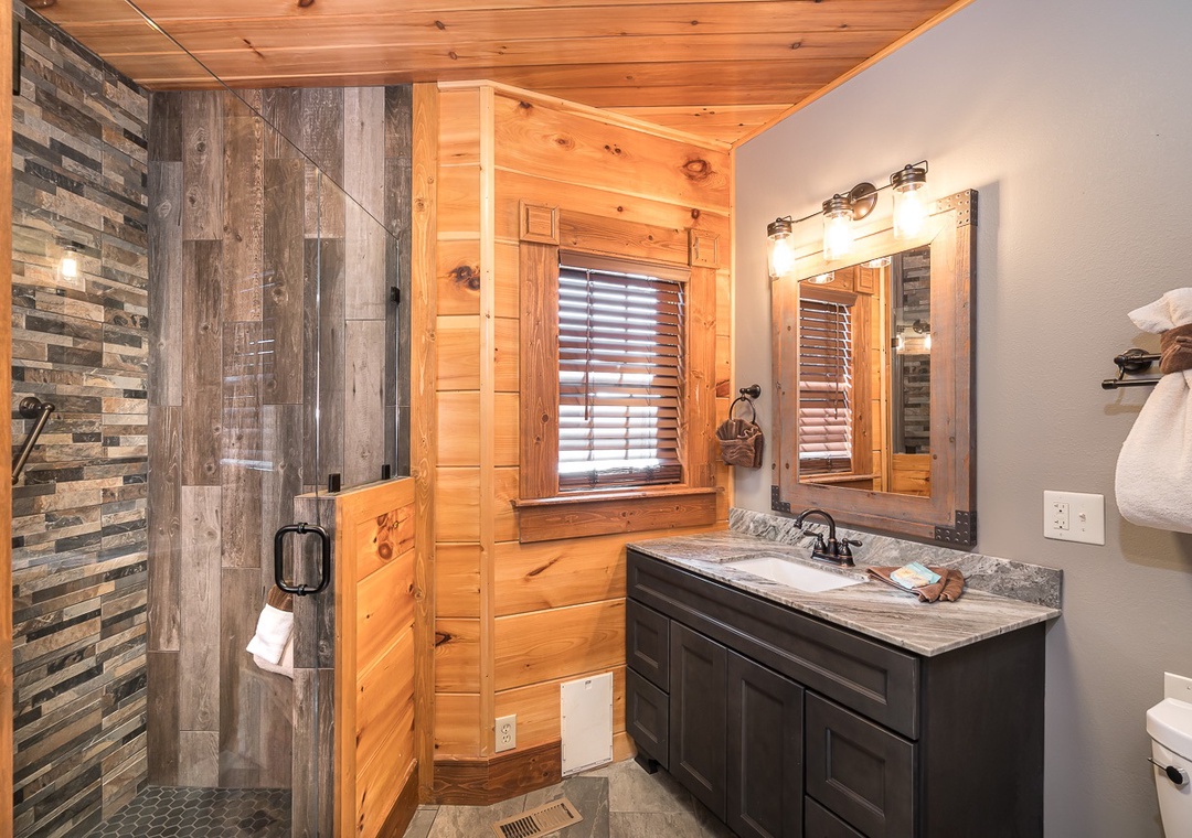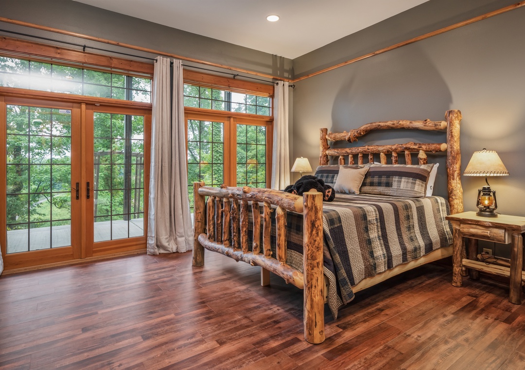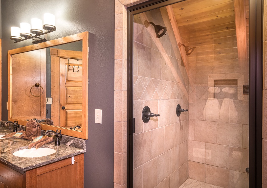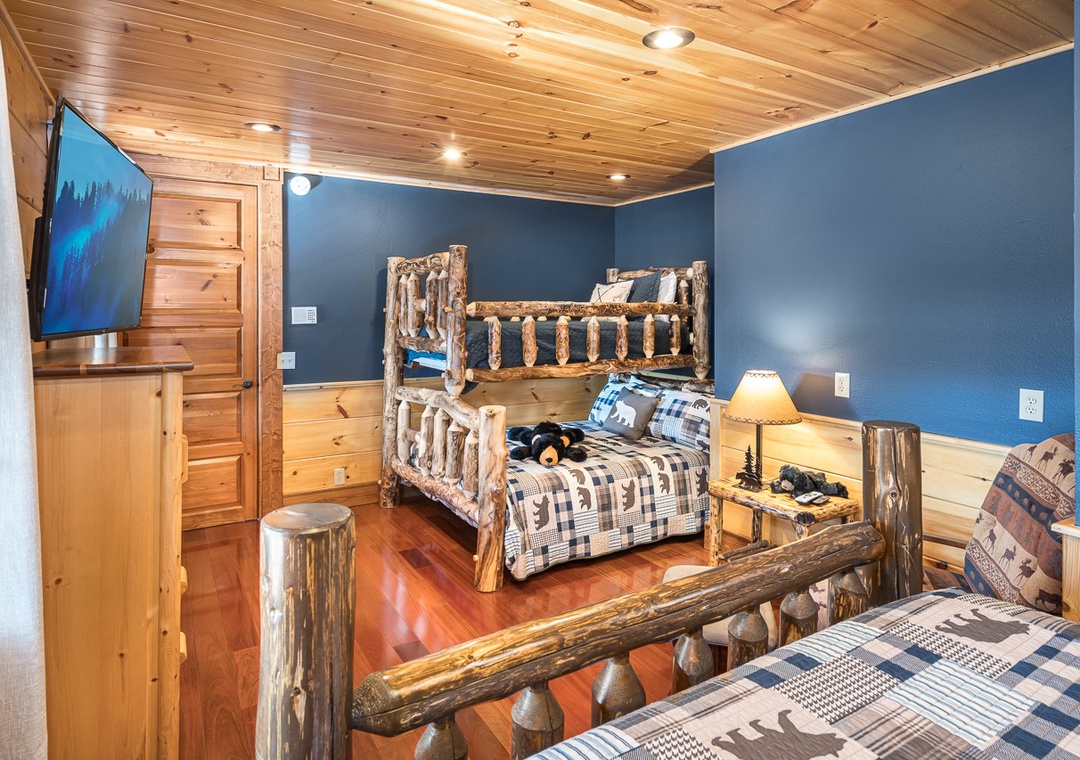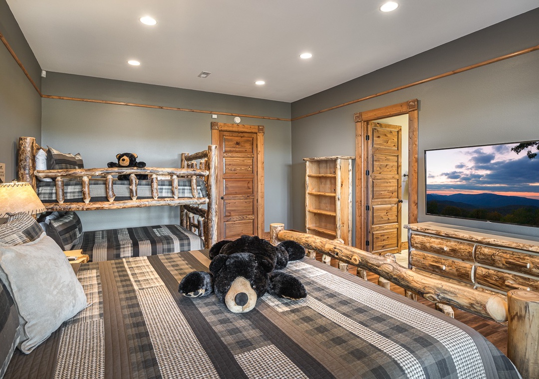 This beautiful lodge has 8 large bedrooms. Three are located on the main floor and 5 are family suites with beds for both adults and children. The bedrooms all have large, smart, streaming, flat screen TVs with cable, beautiful handcrafted log furniture, comfortable bedding, and blackout curtains to allow you to sleep in as long as you like. On the main floor: the first bedroom has a queen bed and a twin over queen bunk. The next bedroom is a gorgeous master suite with a king bed and a 65 inch tv over a stacked stone gas fireplace. In the bathroom are soaring ceilings with beautiful beams. There is a travertine shower with double shower heads and a separate soaker tub. The third bedroom has a beautiful king log bed, stacked stone gas fireplace, and a wall of windows for enjoying the beautiful view. Shares a hall bathroom with the queen bedroom on the main floor.