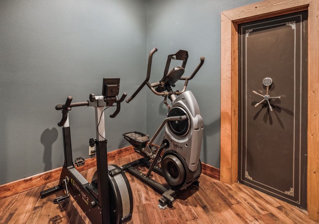 Downstairs … the 8th bedroom is yet another family suite. Here you will find a king log bed and a log queen over queen bunk bed allowing this bedroom to sleep 6. The room has two French doors opening onto the back patio. A perfect place to enjoy your morning coffee. The bathroom has a large tile shower with two shower heads and a third rain shower head. It is also a steam shower. Lots of space on the lower level including a wet bar area with a beverage refrigerator, sink, coffeemaker and popcorn machine. Perfectly located close to the huge theater room that is also on this floor. The theater room has an over 11 foot screen, HD projector, 7.1 Dolby surround sound and 19 reclining leather seats. This is an experience not soon to be forgotten. What a great place to share a movie with your whole group. For all of you active vacationers, we have also provided a super nice exercise room. We have a Stairmaster and stationary bike - both facing a streaming flat screen TV. There is also a pull up bar for upper body work outs. This is perfect for those who like to keep up with a work out routine no matter the location. Yes! you’re on vacation so you can do it or not do it. Securely locked to keep the younger ones safe unless you allow them entry.