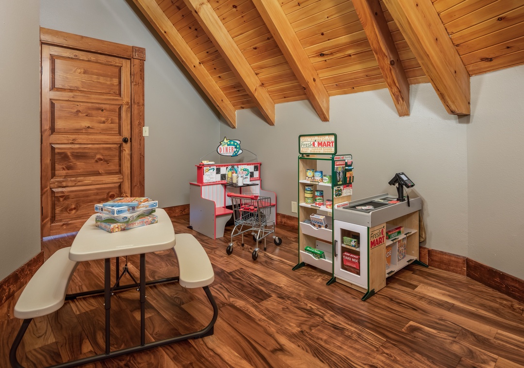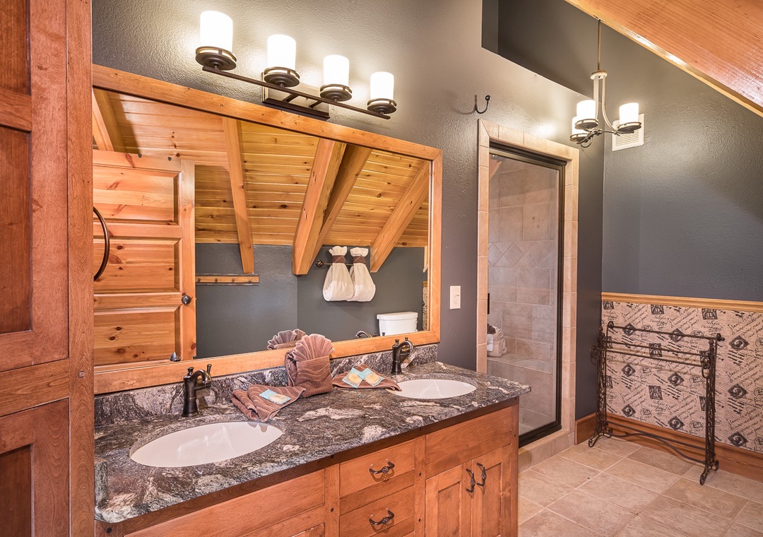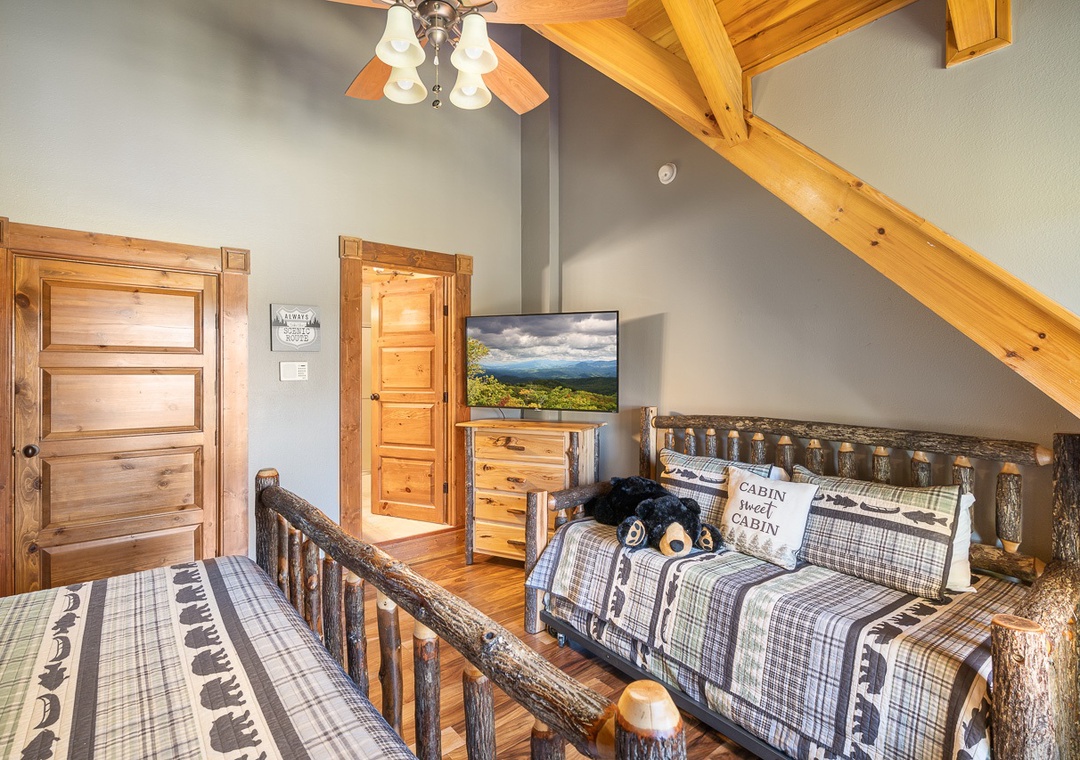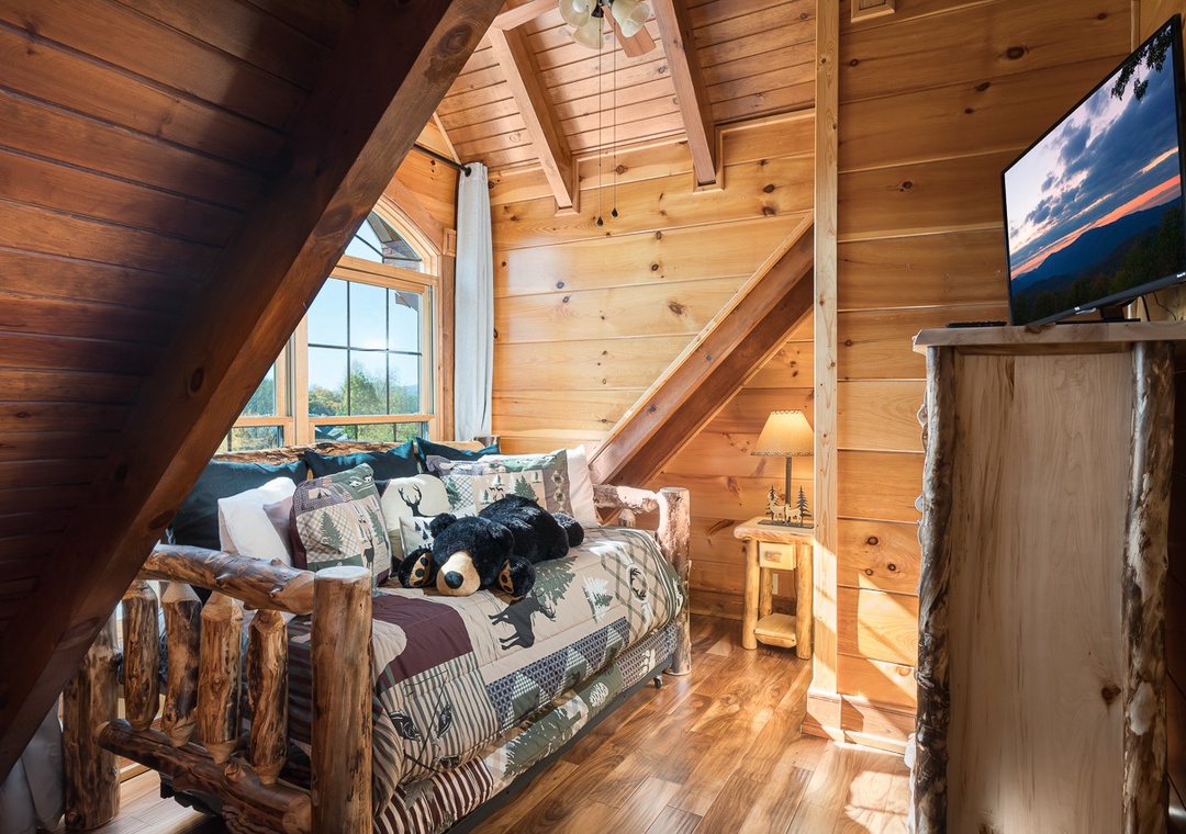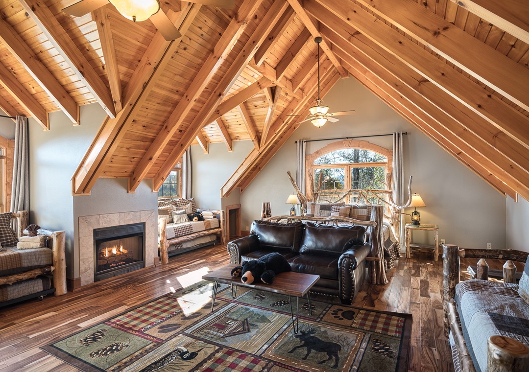 Up the stairs from the main floor are two large master suites. Both have balconies, cathedral ceilings with large open beams, and hand crafted log king beds and log daybeds with trundles for additional sleeping. The bedroom at the end of the hall has windows facing a mountain view. Wow! Take a back staircase to another grand master bedroom suite with multiple windows facing the mountain view and a gorgeous artisan log king bed. This huge room also has 3 log daybeds with trundles for an additional 6 beds. That’s right this enormous room sleeps 8. Adjoining the bedroom is a kid’s playroom with hours of fun to be had by the younger members of your party. The bathroom for this master suite has a large tiled shower with two shower heads and a beautiful granite counter and vanity. Great area for a family and private from the rest of the cabin.