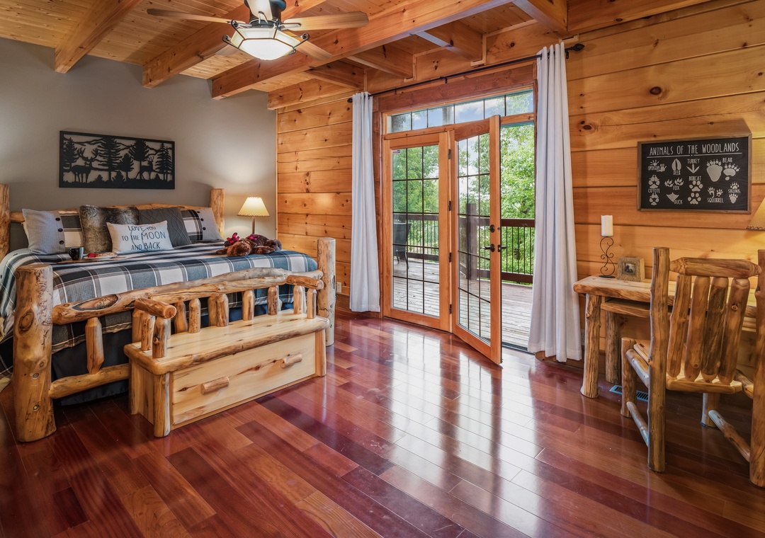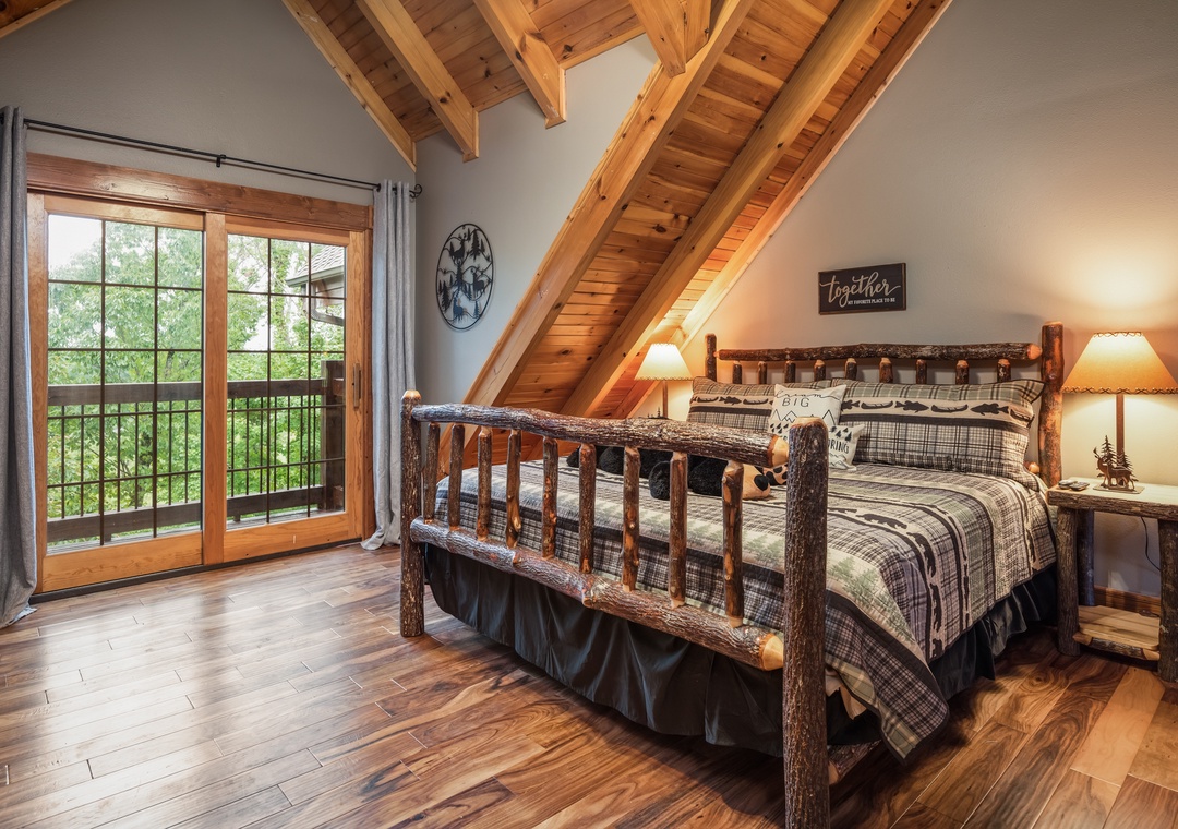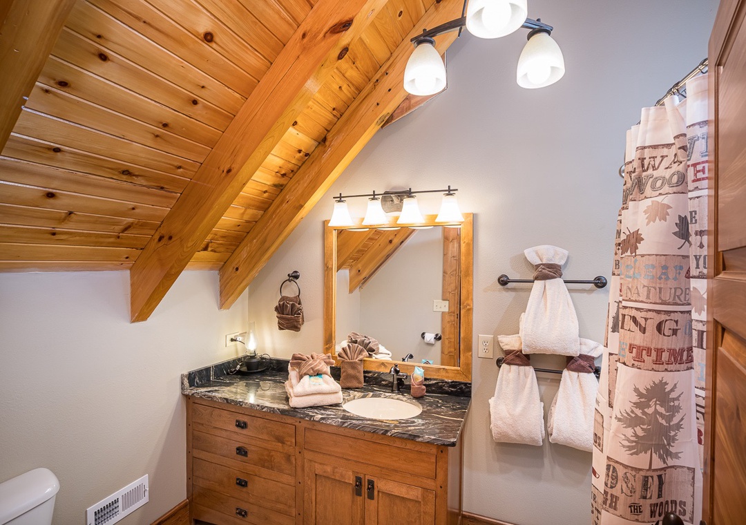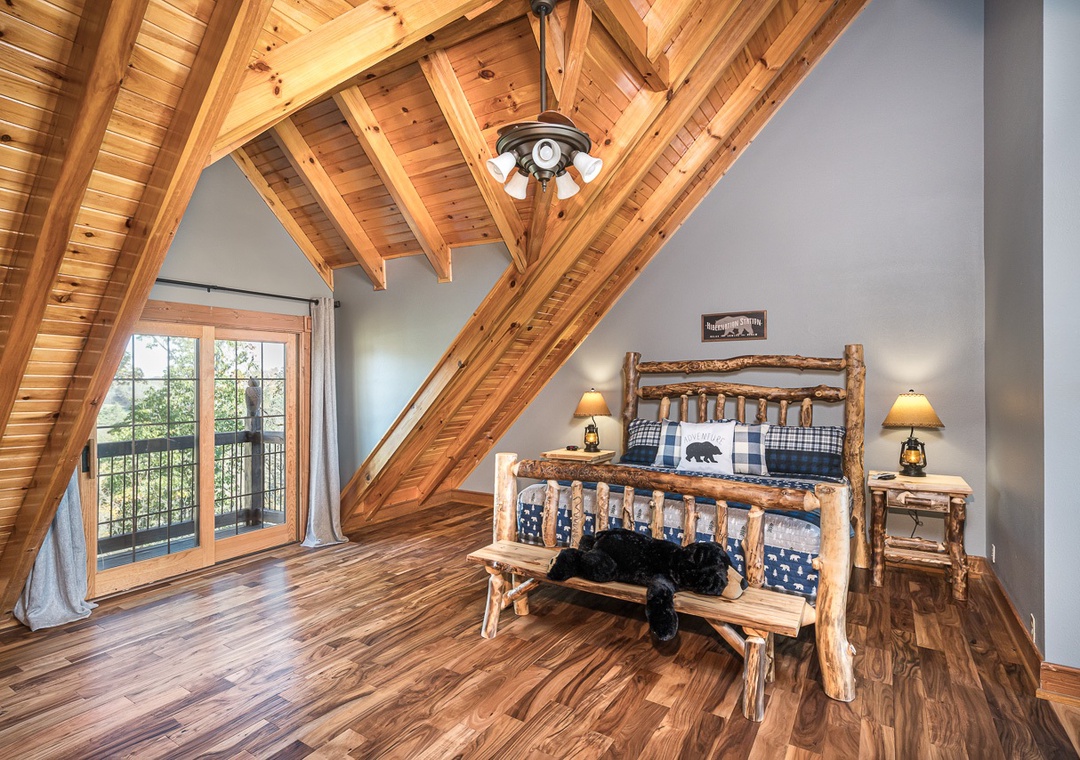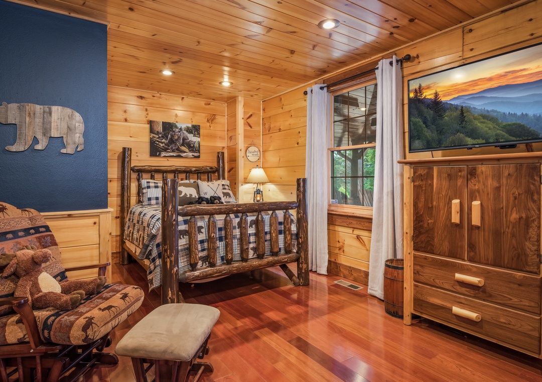 Up the stairs from the main floor are two large master suites. Both have balconies, cathedral ceilings with large open beams, and hand crafted log king beds and log daybeds with trundles for additional sleeping. The bedroom at the end of the hall has windows facing a mountain view. Wow! Take a back staircase to another grand master bedroom suite with multiple windows facing the mountain view and a gorgeous artisan log king bed. This huge room also has 3 log daybeds with trundles for an additional 6 beds. That’s right this enormous room sleeps 8. Adjoining the bedroom is a kid’s playroom with hours of fun to be had by the younger members of your party. The bathroom for this master suite has a large tiled shower with two shower heads and a beautiful granite counter and vanity. Great area for a family and private from the rest of the cabin.