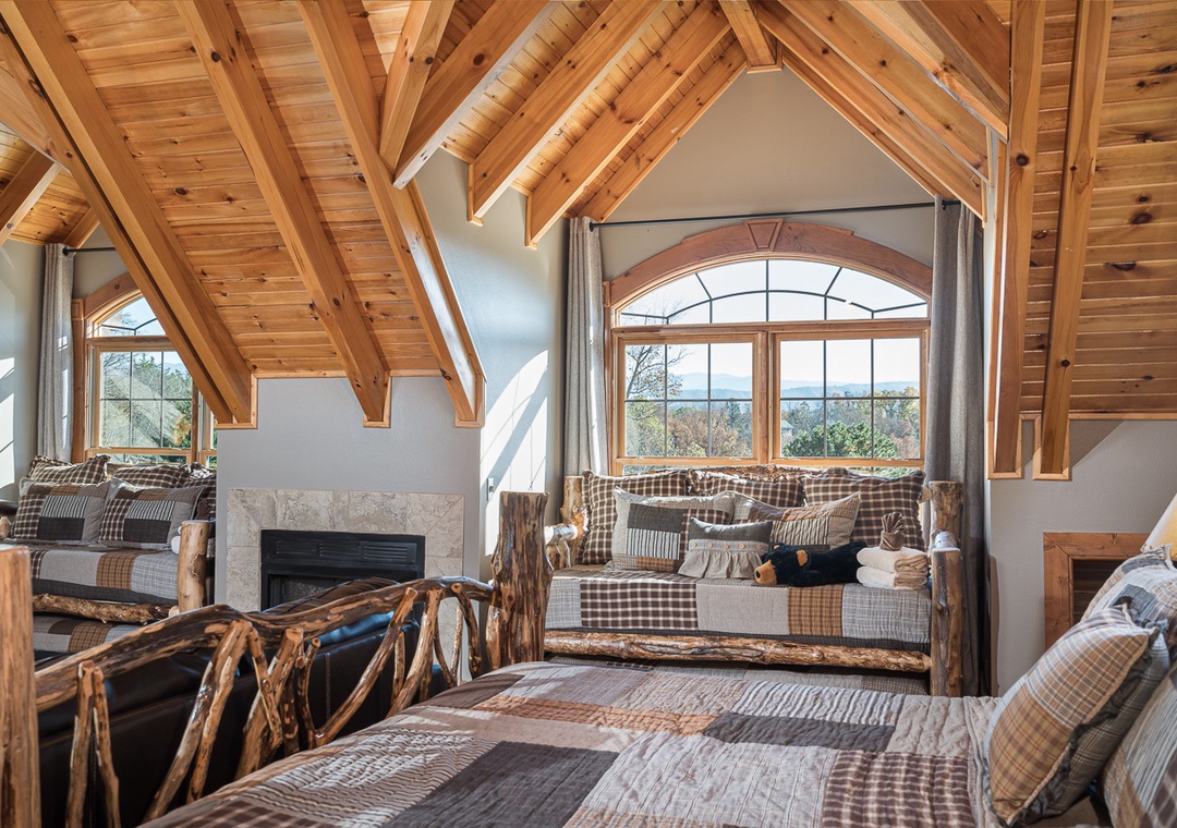 Second Floor Up -King bed master suite with tub/shower and daybed with trundle -King bed master suite with tub/shower and daybed with trundle, private closet large enough to hold Pak n play comfortably -Third Bedroom with Daybed and trundle shares bath with one of the bedrooms Also upstairs and over the game room - but accessed only via a separate staircase is a gigantic private suite: -King bed master suite, walk in shower, with 3 daybeds with trundles, -sleeps 8, with fireplace and large playroom - this is a spacious suite separated from main area of house but easily accessed with its own private stair case, peek a boo mountain view from this fabulous bedroom suite