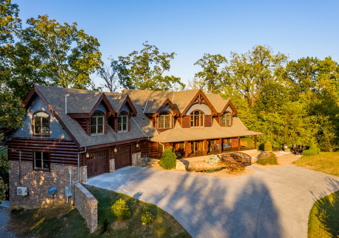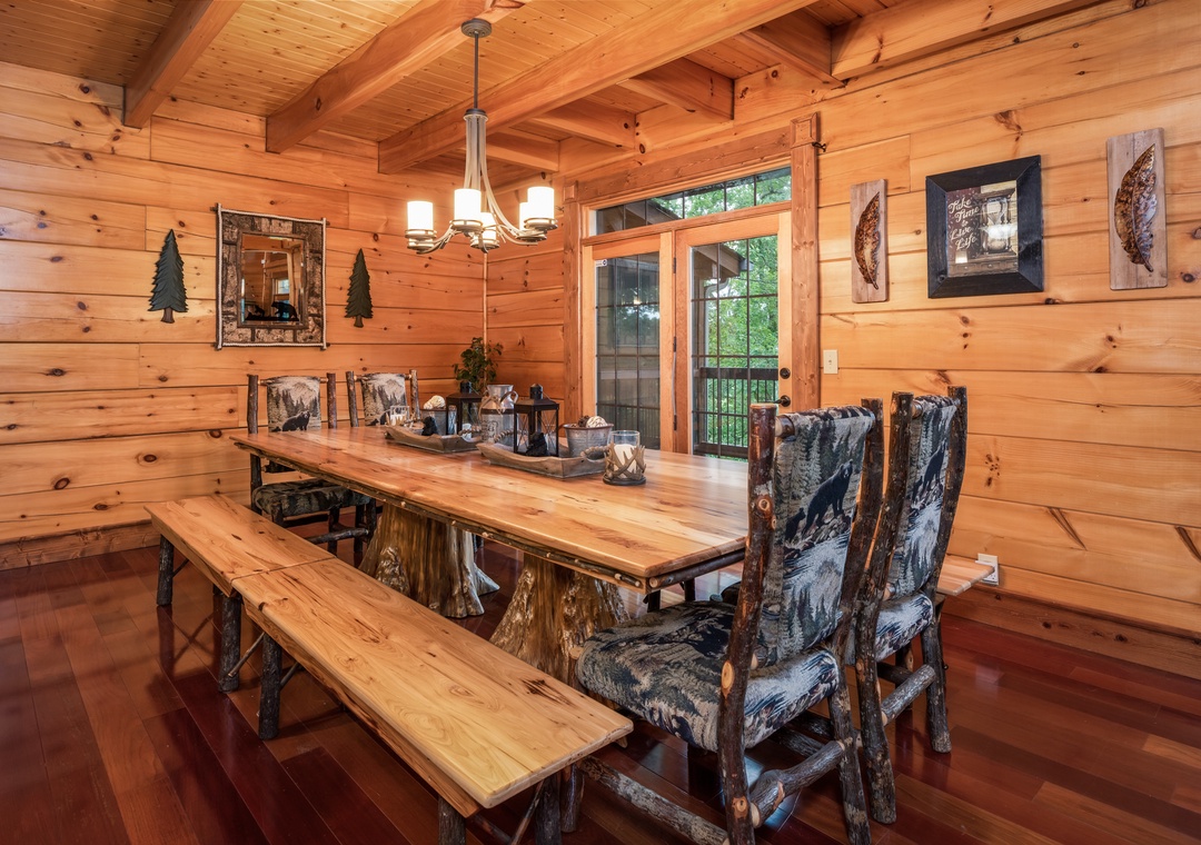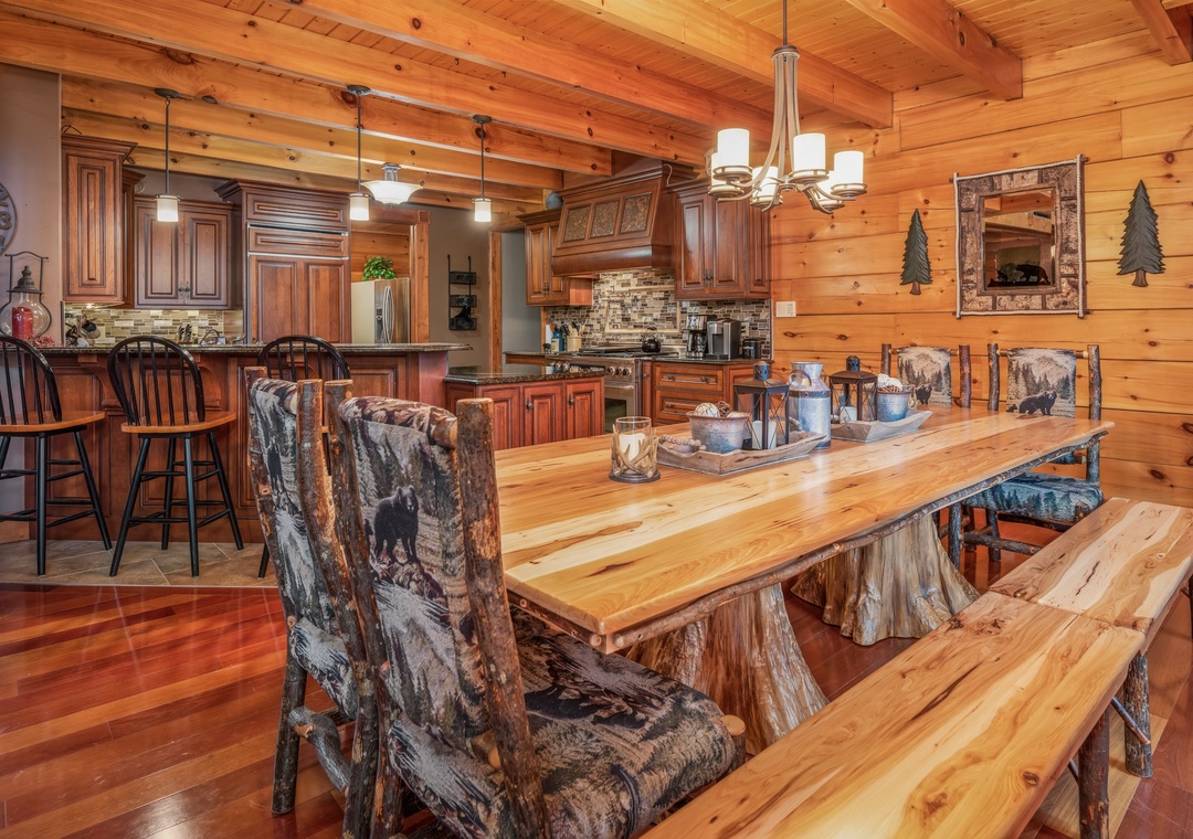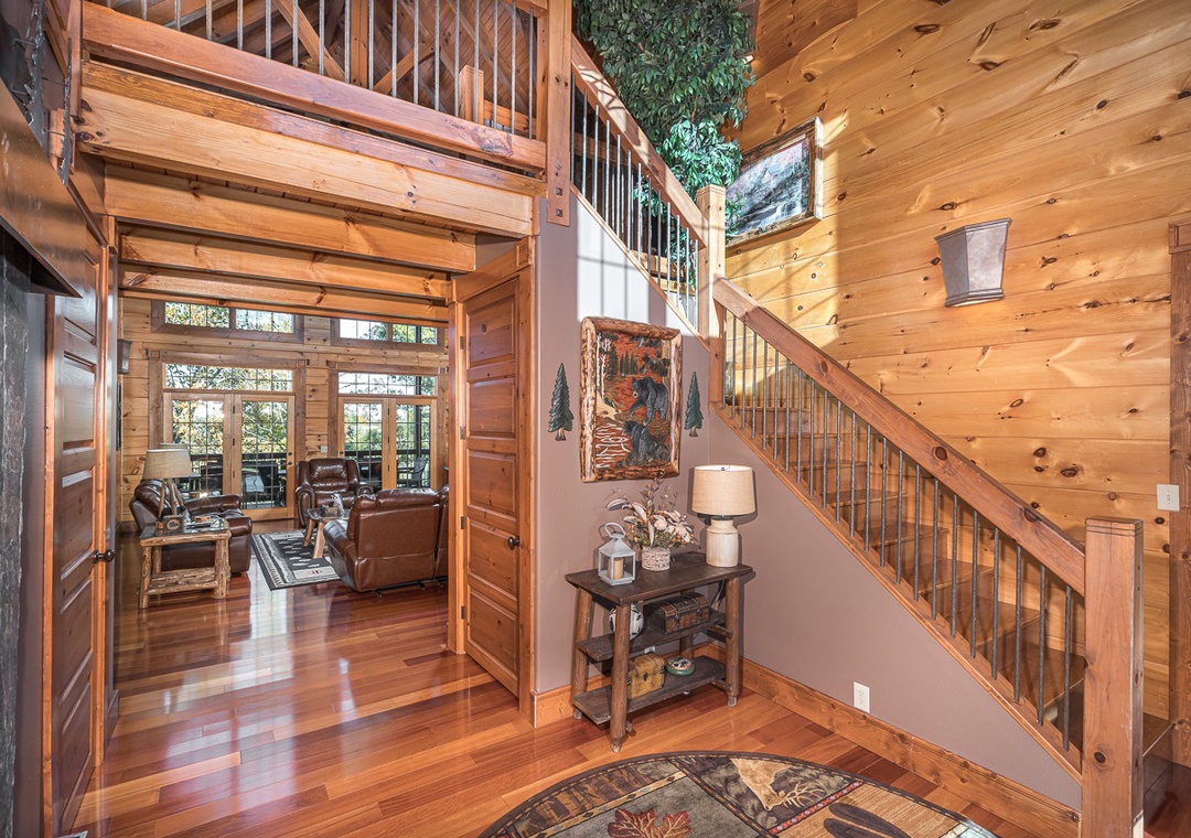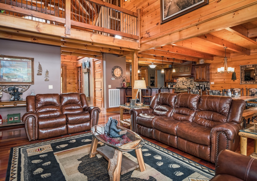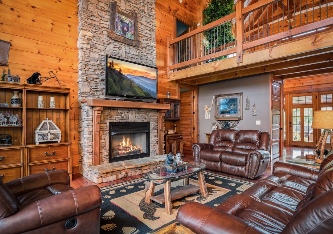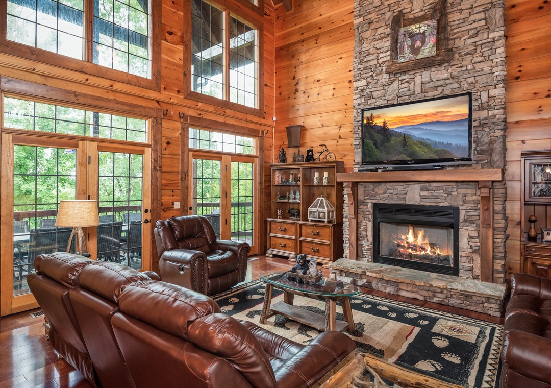 You will enter this gorgeous cabin through the large rustic front door into the open foyer with cathedral ceilings. Then on into the great room which really makes this lodge grand! A 24 foot high wall of windows and a stacked stone gas fireplace from floor to ceiling make this room truly breathtaking. Gorgeous leather couches with 6 comfy recliners make this room as comfortable as it is beautiful. With a huge 65 inch flat screen TV over the fireplace you are ready to watch the big game or enjoy a show together.