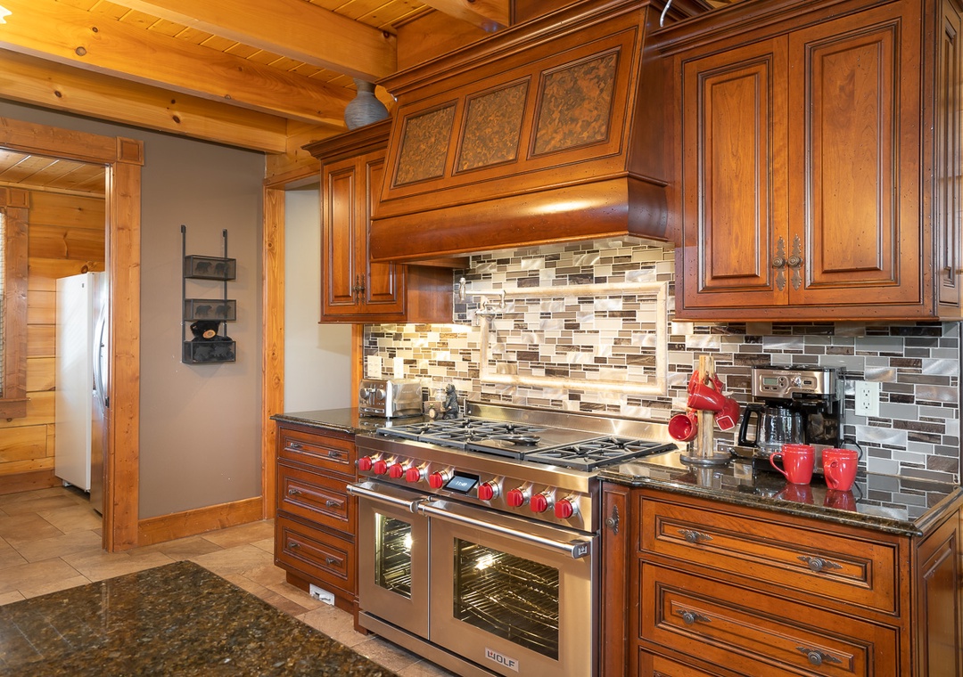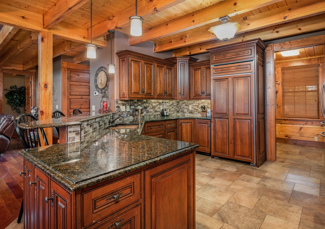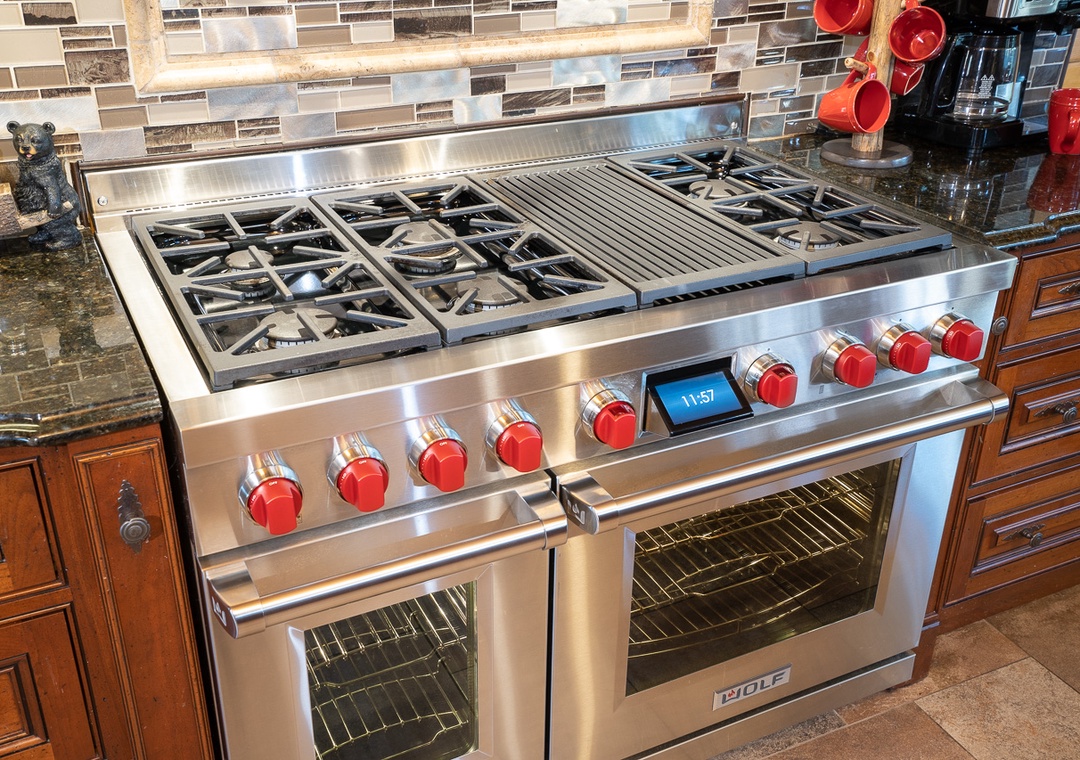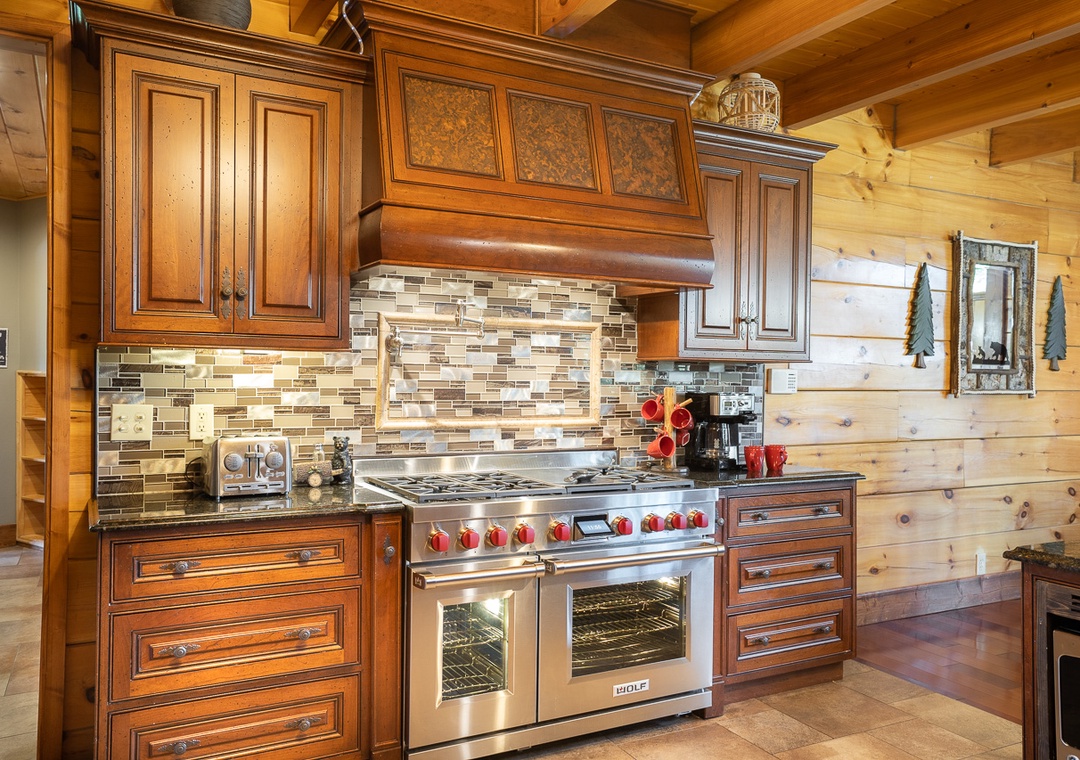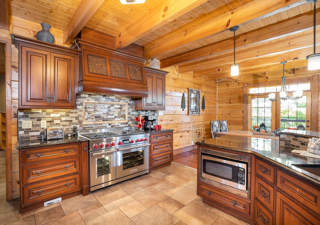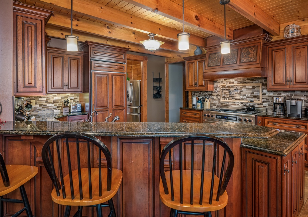 The open layout with the kitchen and dining room makes this a fantastic space for family or group gatherings. The dining room has a custom built giant table with tree stumps for legs and enough seating for 14 with 4 additional seats at the bar. Additional seating for 18 more outside on the deck. The granite kitchen features a brand new in August 2021 48" Wolf dual fuel range with 6 gas burners and an infrared char broiler and two convection ovens. It's gorgeous and will be a pleasure to cook on. There is also a giant subzero refrigerator, a Bosch dishwasher with an additional refrigerator and stand up freezer in the large pantry. Anyone in your group enjoy cooking? They will absolutely fall in love and spend their time preparing fabulous meals for all of you.