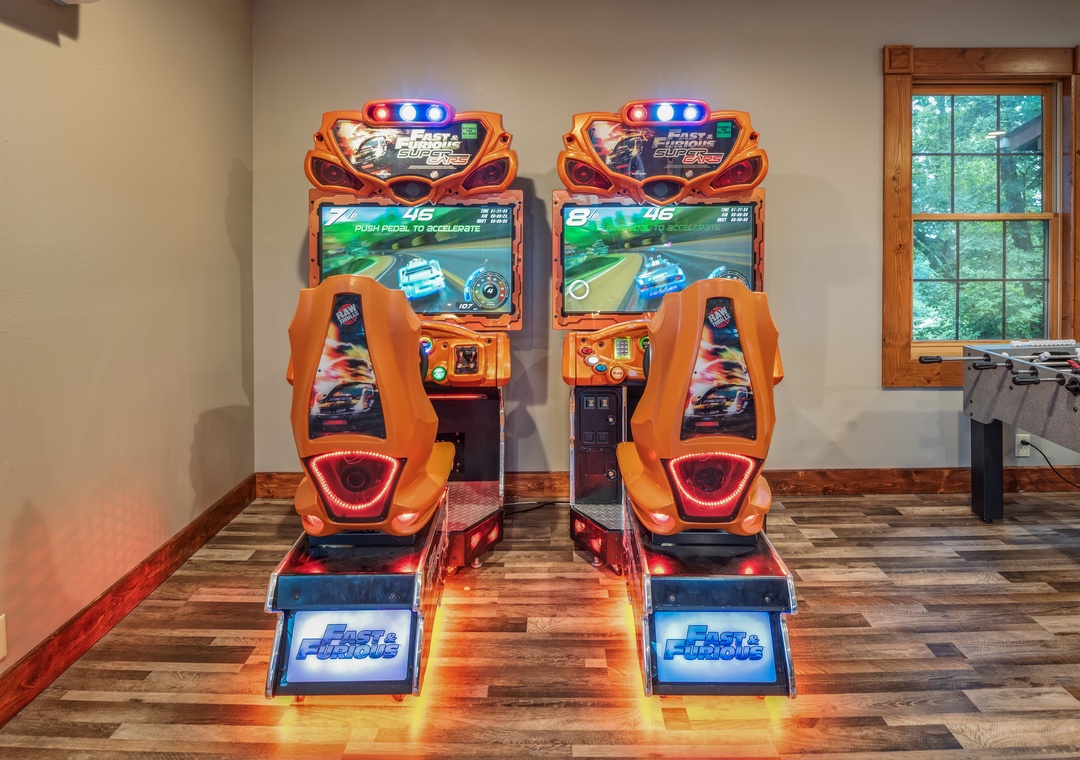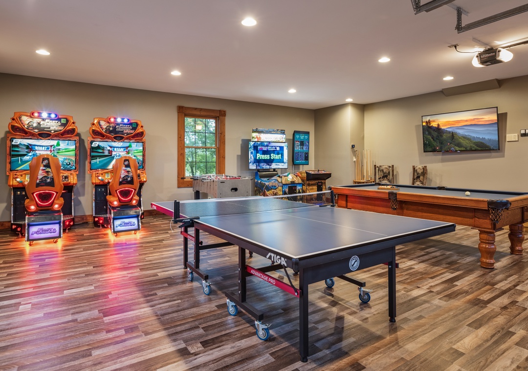 Walk down the hall and out to the huge game room with enough fun to keep a crowd busy for hours. Play a game of pool on the full size slate pool table, ping pong on the tournament table, foosball, or basketball in the hoops arcade. Race a friend on the linked driver arcades with huge HD flat screens, force feedback steering, and surround sound. Wow! The Big Buck Hunter HD is a family favorite with its massive 55 inch screen and incredible graphics. There is also a two player multicade with a giant flat screen monitor for playing all the classics like Pac-man and Galactica.