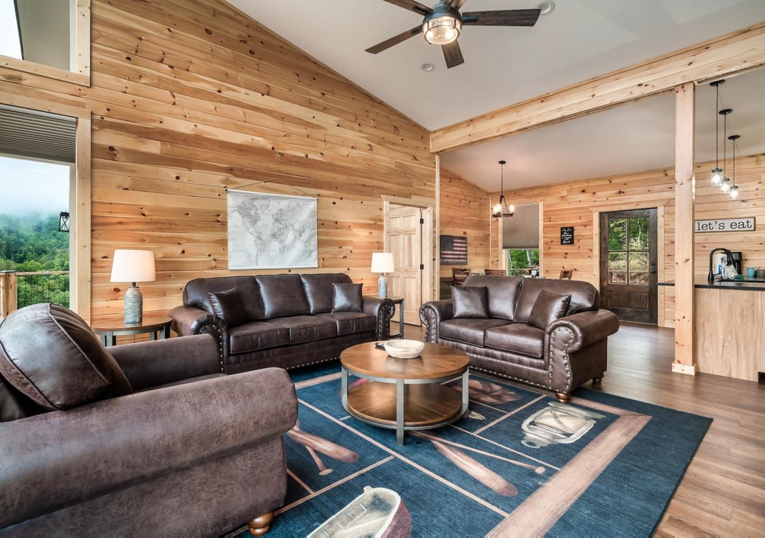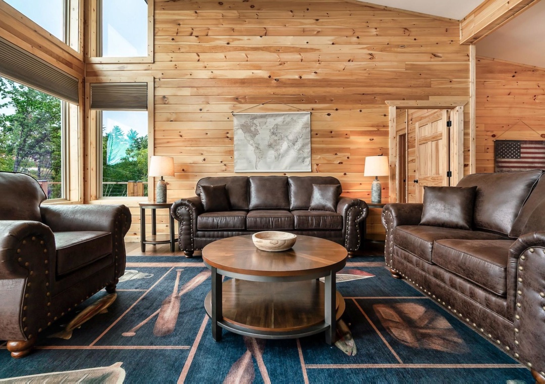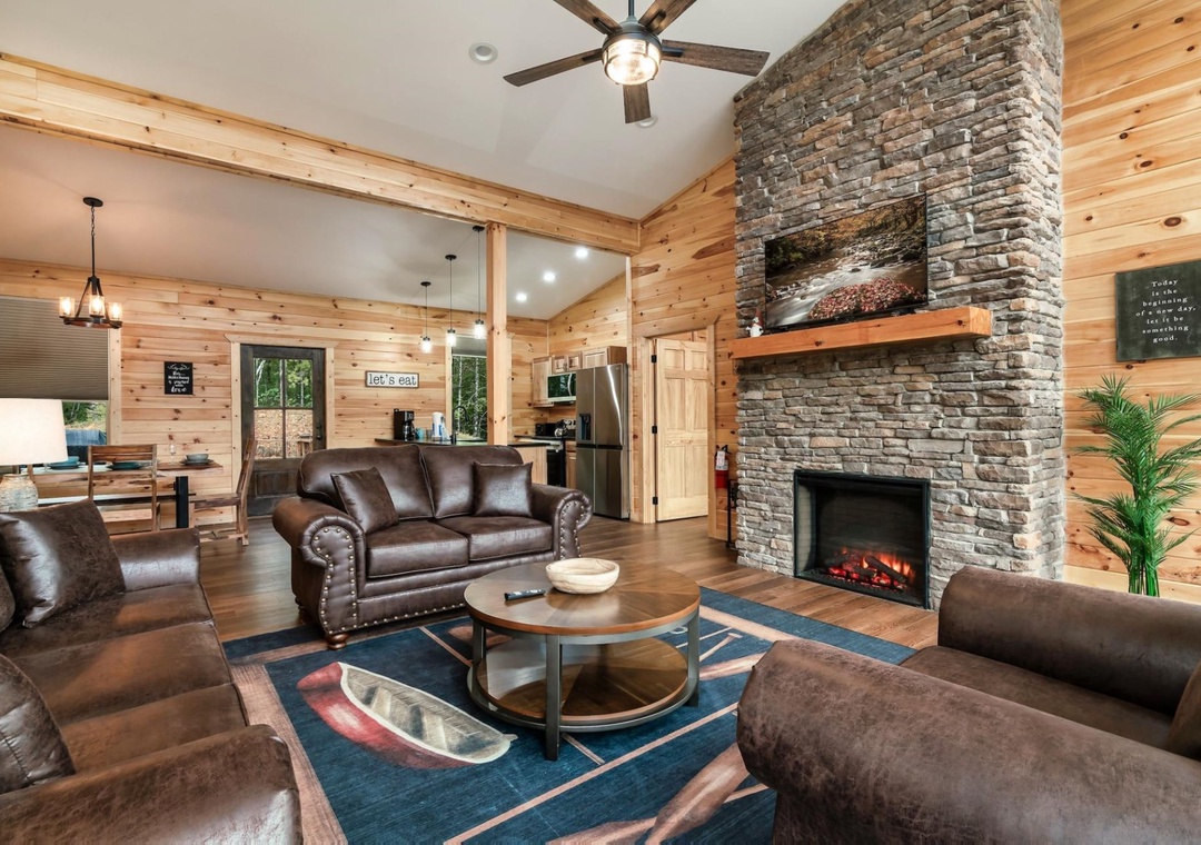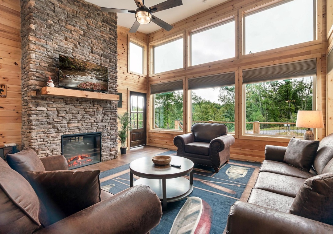 Step inside to an inviting open layout with hardwood floors, natural shiplap walls, and towering two-story windows that bathe the living space in natural light. A stone-accented electric fireplace offers cozy ambiance beside plush seating and a 50” Smart TV—perfect for movie nights or relaxing after a day of outdoor adventure.