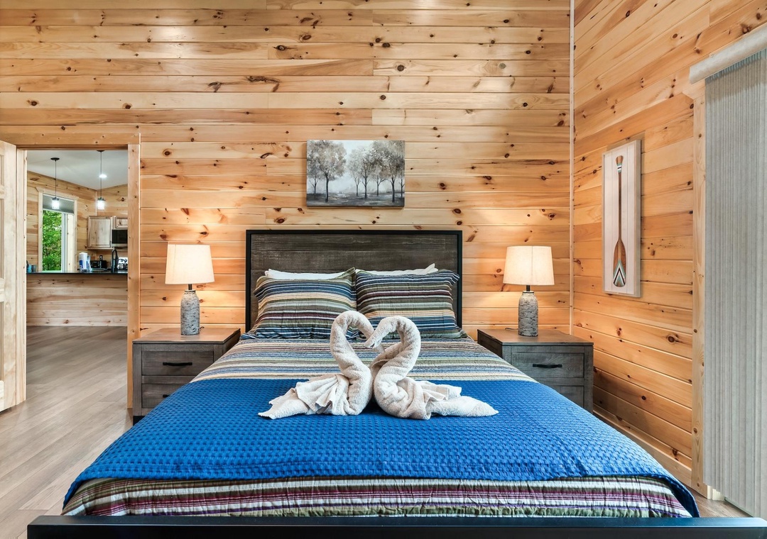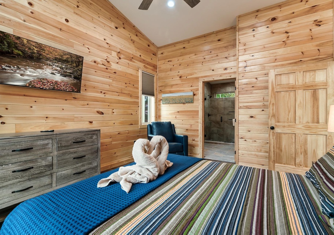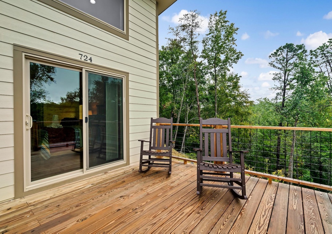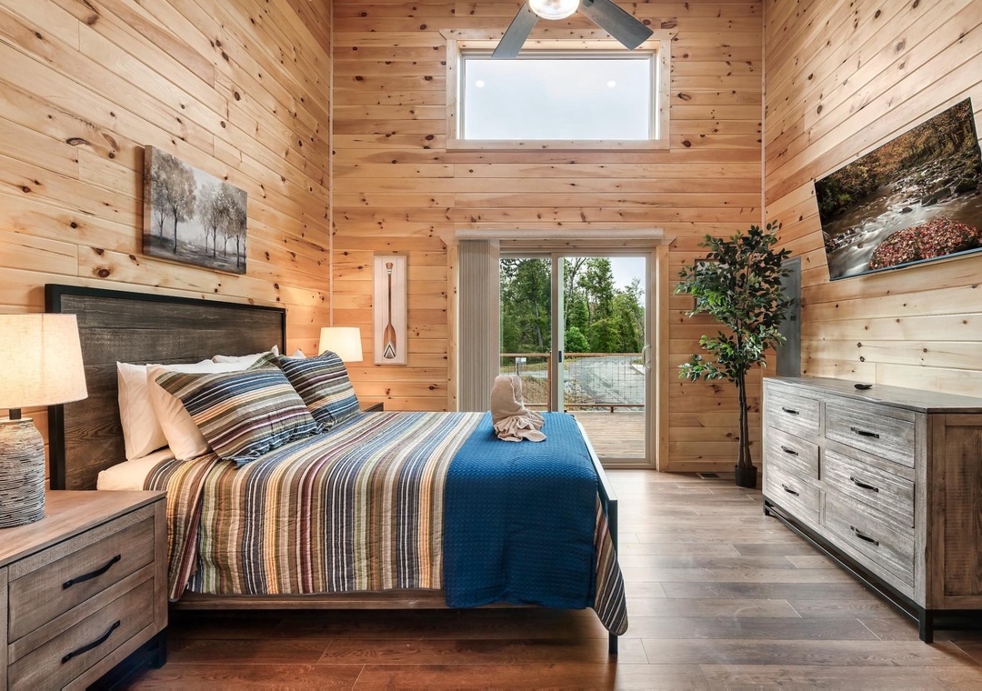 Primary Bedroom: Queen Bed, Private Bathroom (shower only), TV, Deck Access