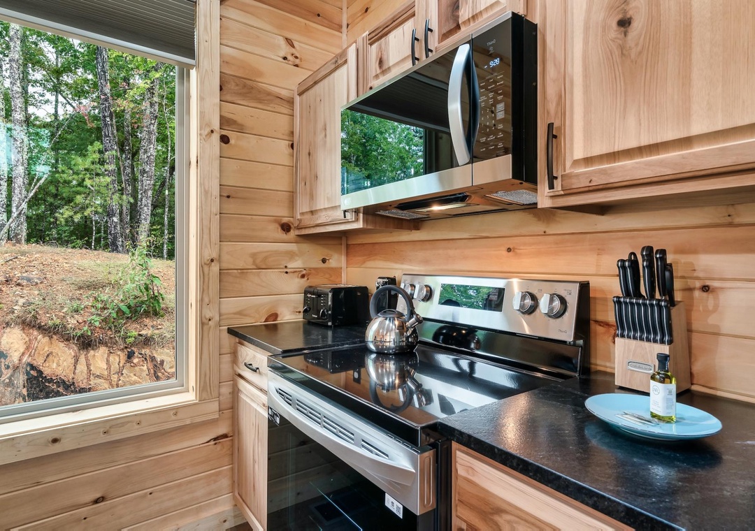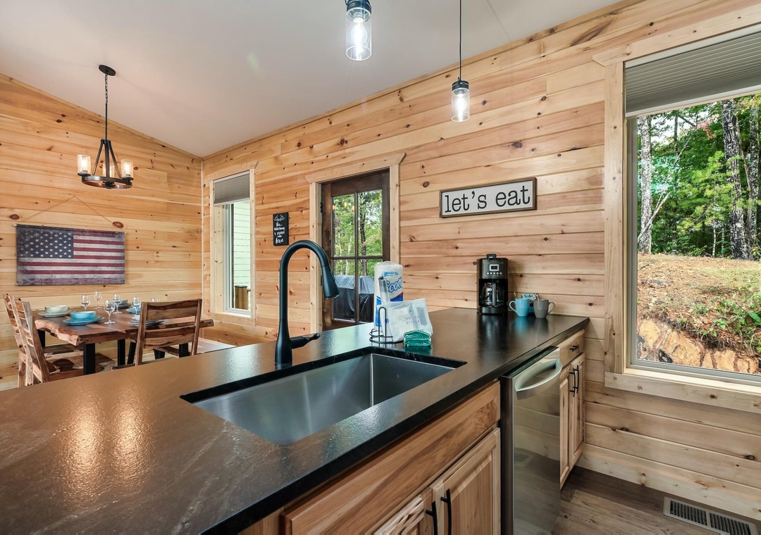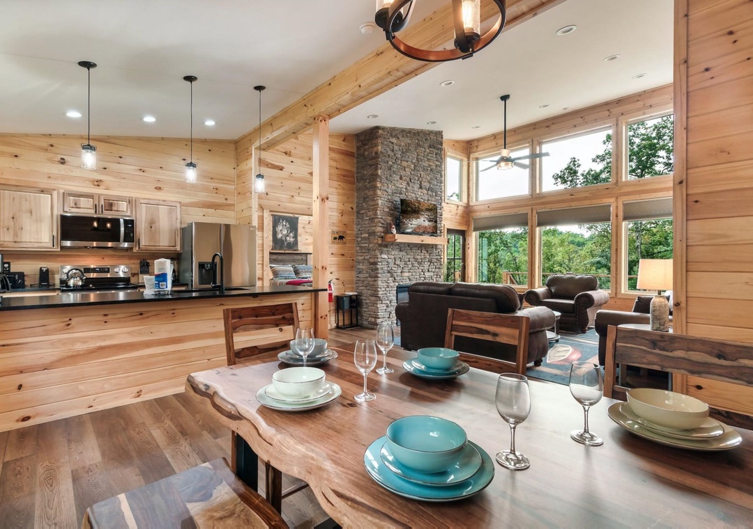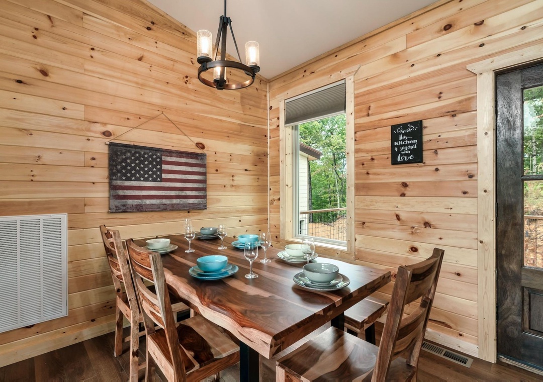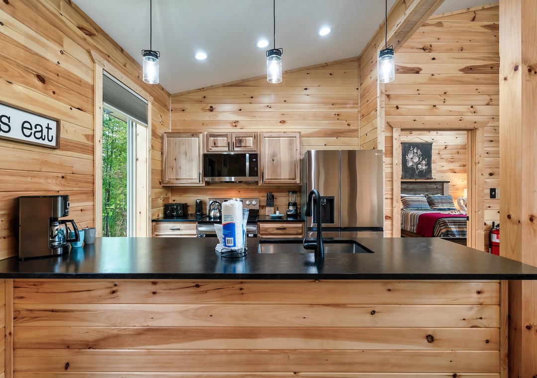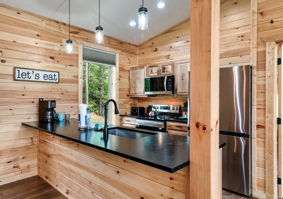 The fully equipped kitchen features high-end appliances, ample counter space, and a picture window framing peaceful forest views. Gather around the live-edge dining table with seating for 4 for homemade meals and good conversation.
