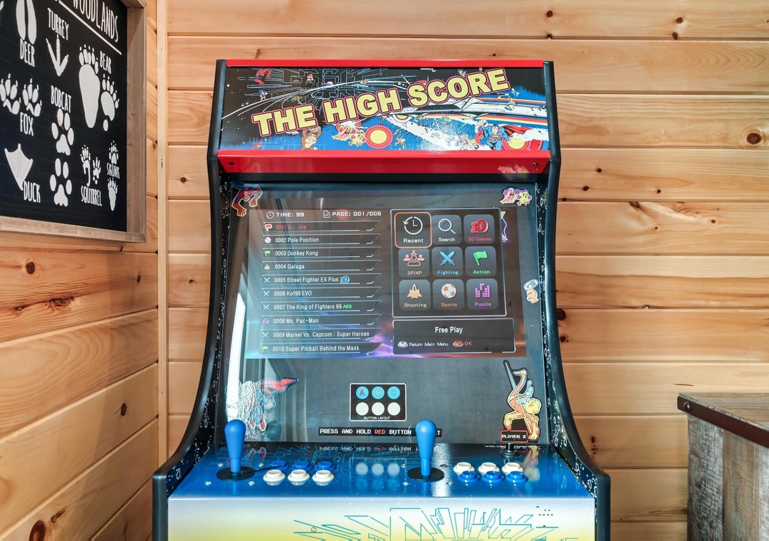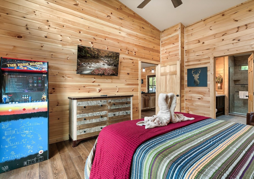 Guest Bedroom: Queen Bed, Private Bathroom (shower only), TV, Deck Access, Arcade Game