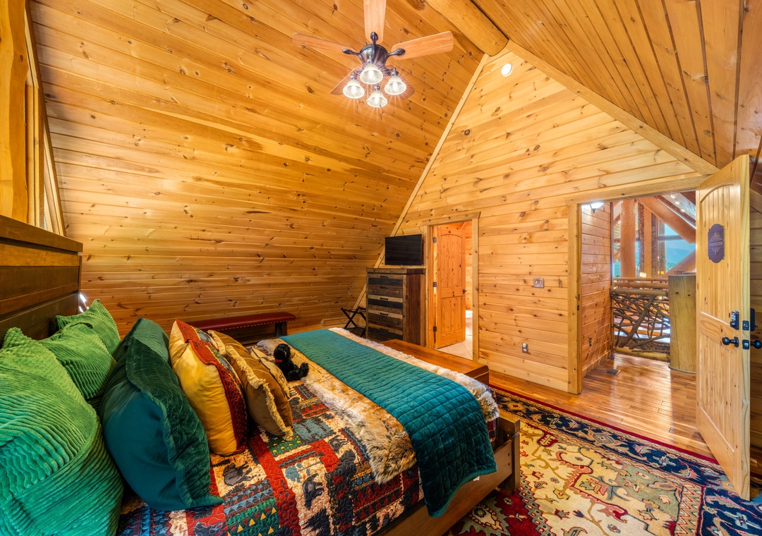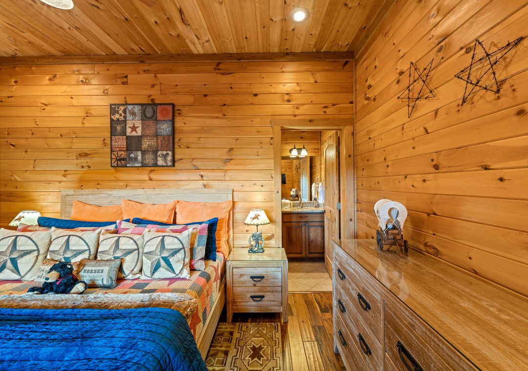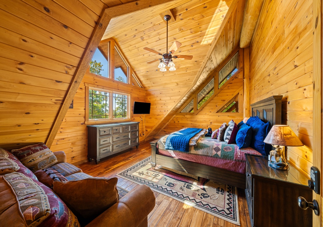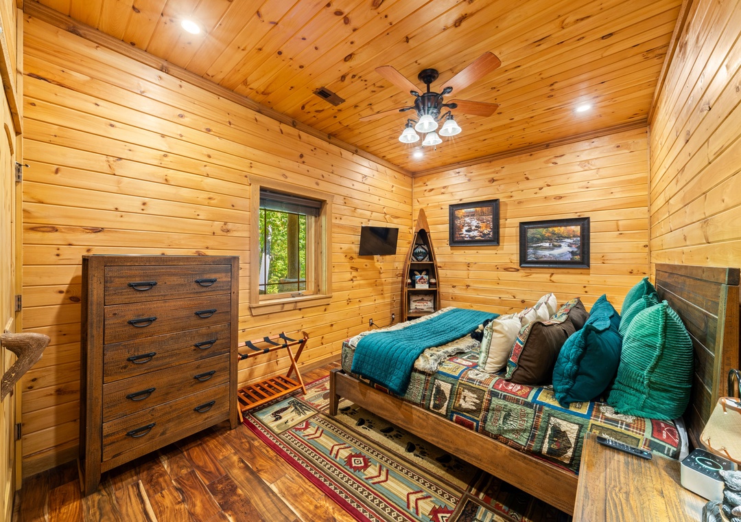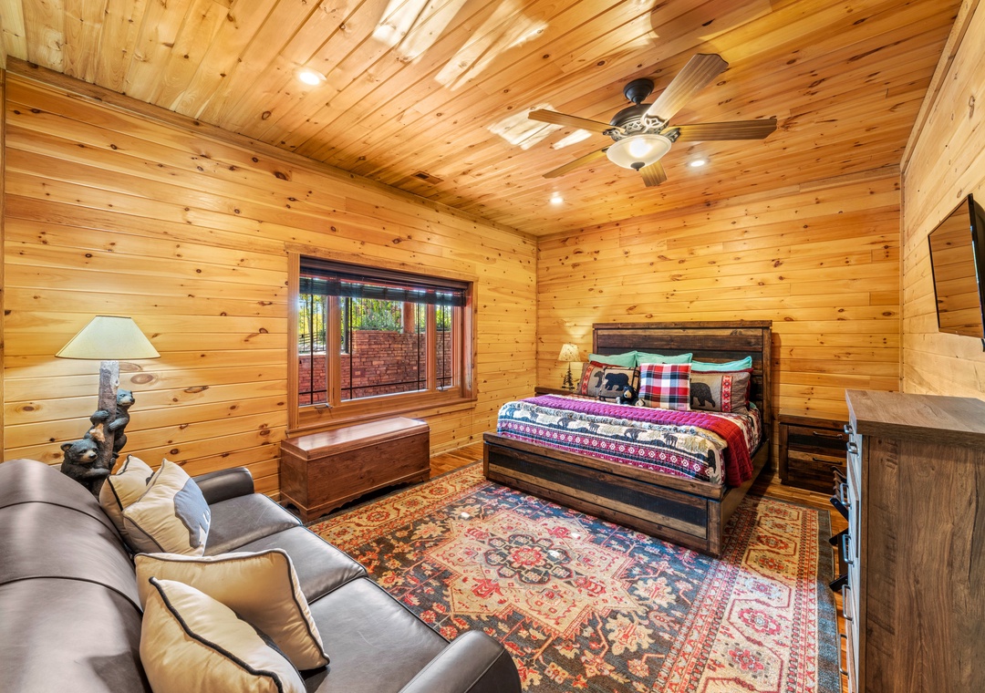 Bearadise – A tropical-themed king bedroom (has two full bathrooms for access in the terrace level hallway), featuring Winston’s Maui escape. Includes a sleeper sofa.