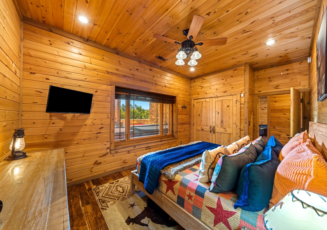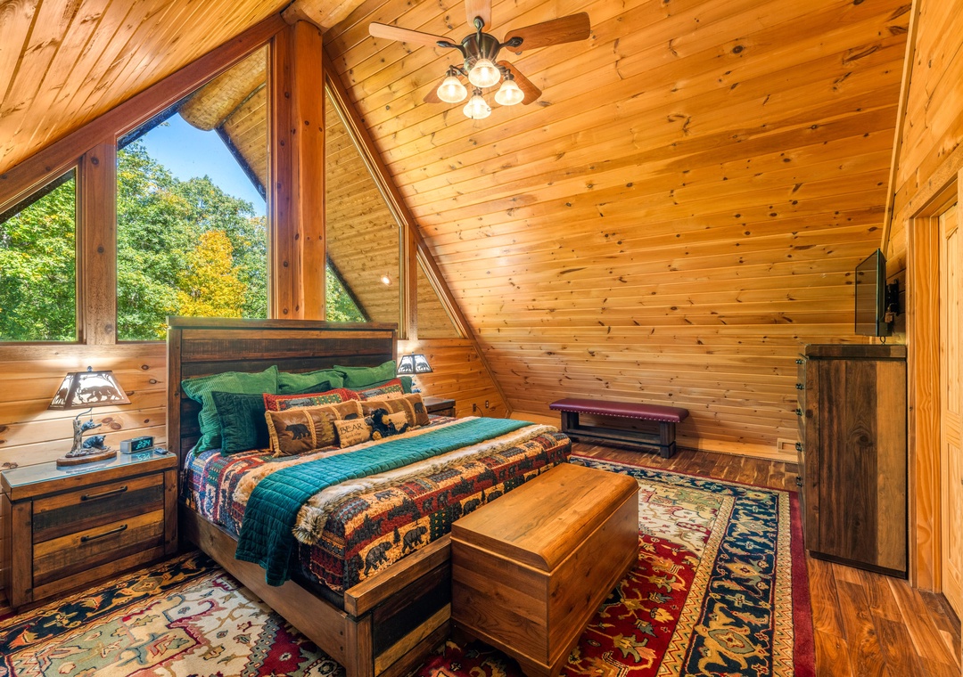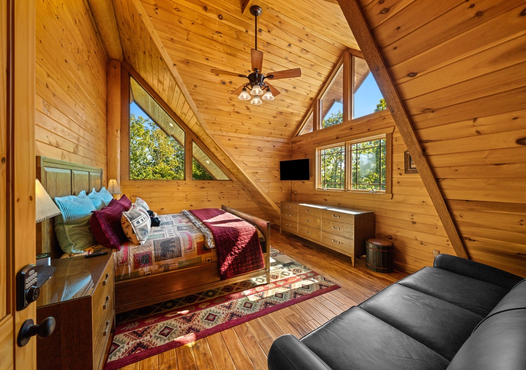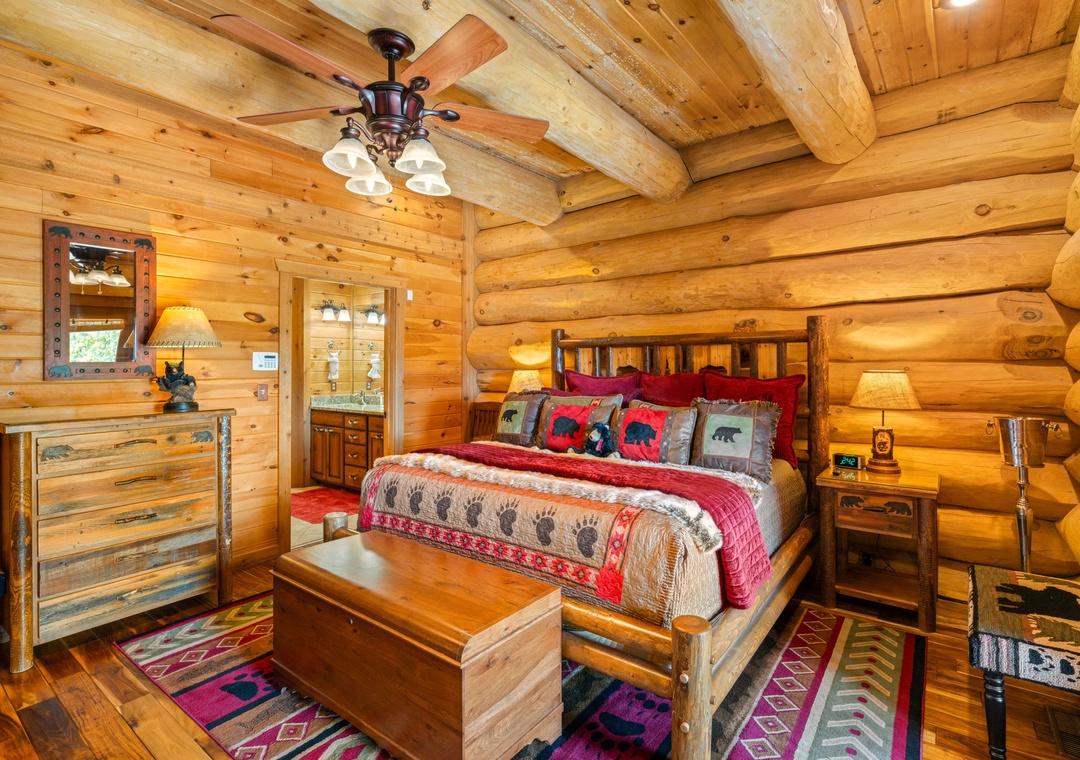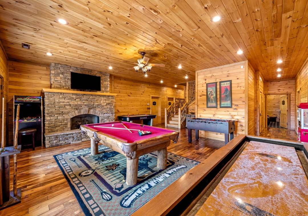 Bearadise – A tropical-themed king bedroom (has two full bathrooms for access in the terrace level hallway), featuring Winston’s Maui escape. Includes a sleeper sofa.