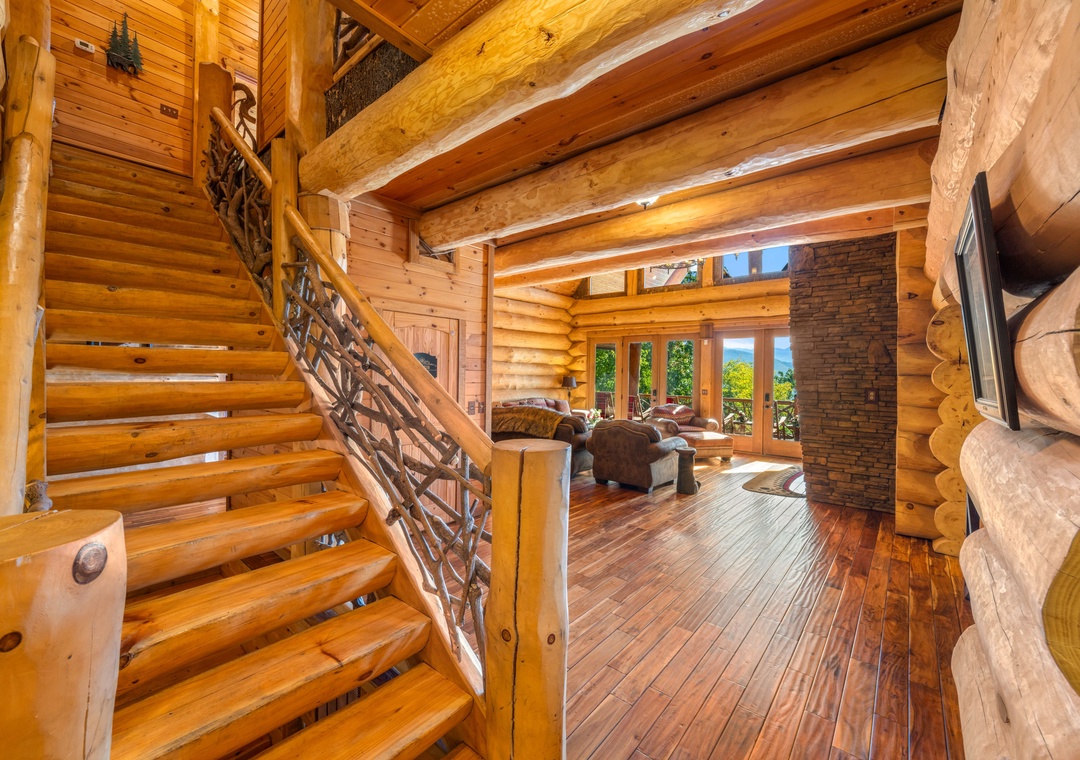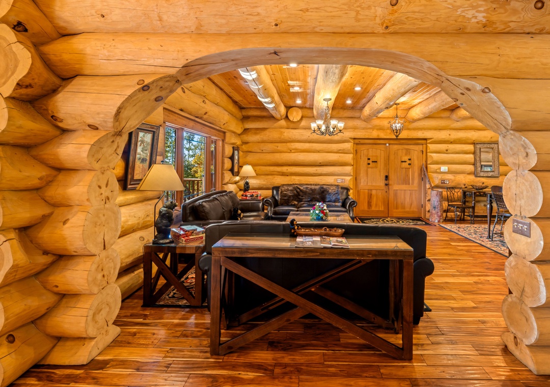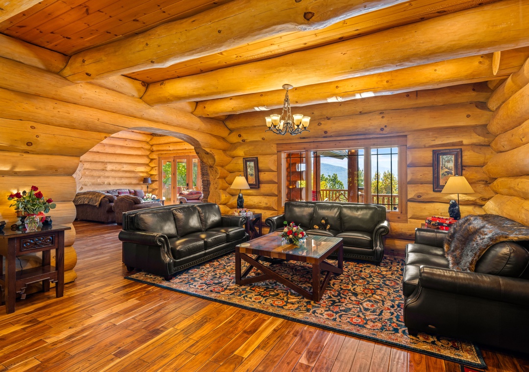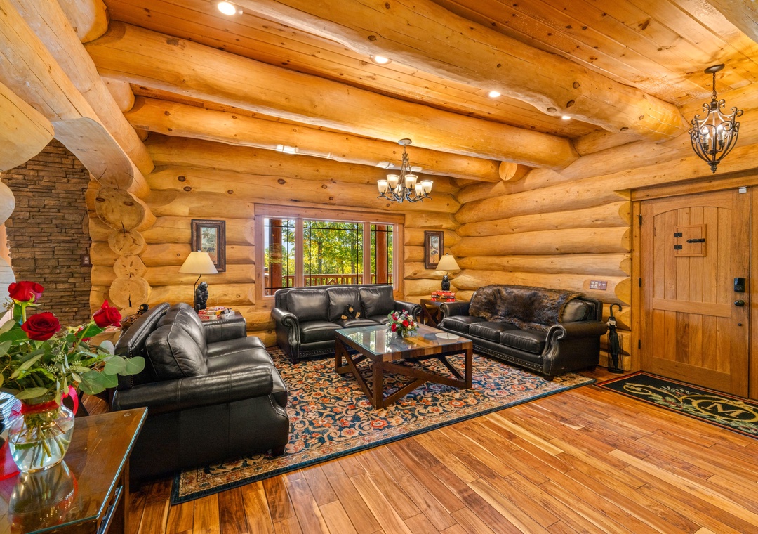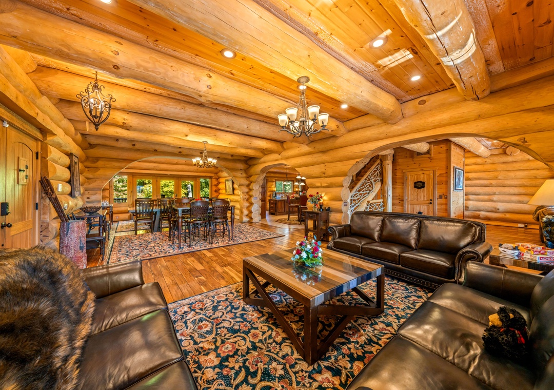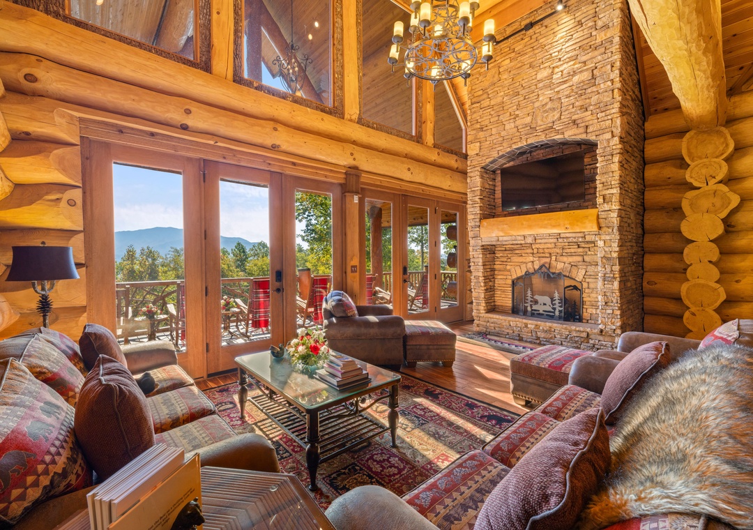 Enter through the impressive front doors into a soaring lodge-style foyer. The main living area features vaulted ceilings, oversized windows, and luxurious leather sofas gathered around a grand stone fireplace — perfect for cozy conversations and fireside relaxation.
