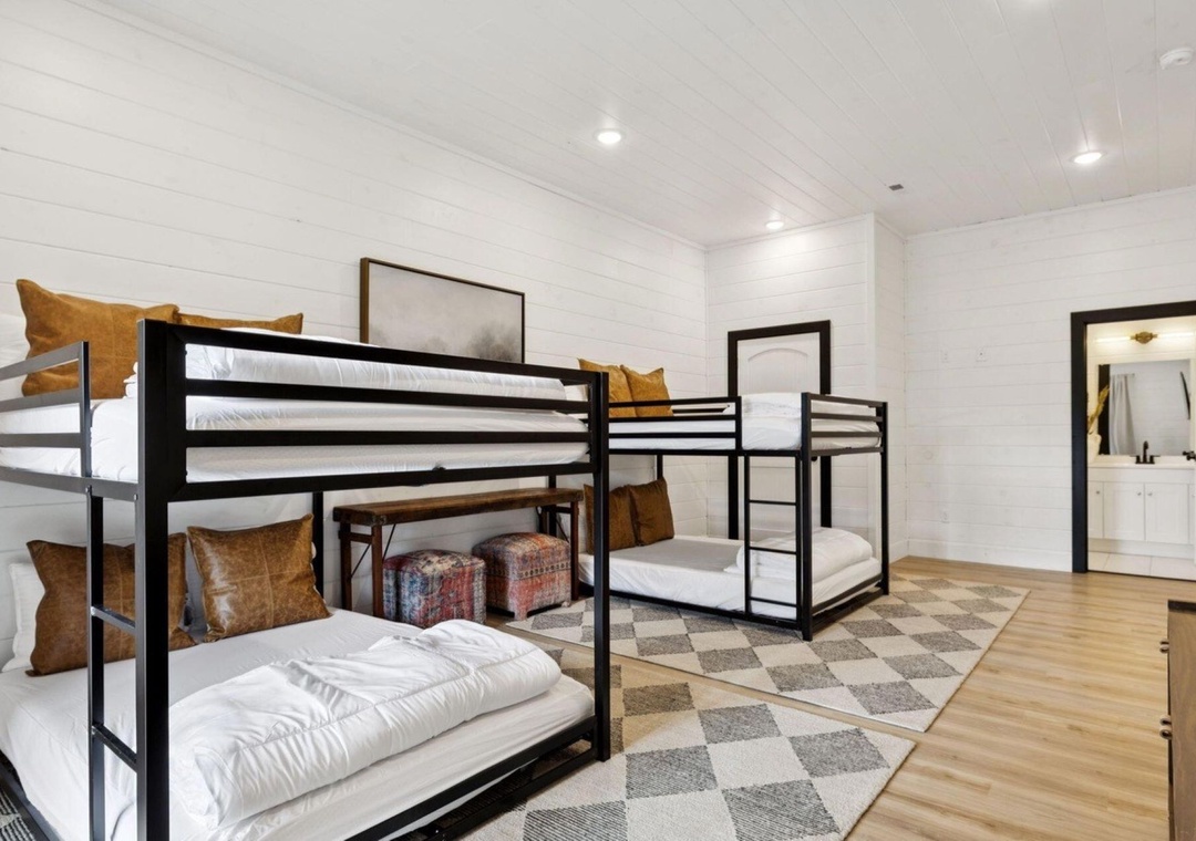 Each of the four spacious ensuite bedrooms is thoughtfully designed for relaxation and privacy. Sleeping arrangements include two King suites, one bedroom with two Queen beds, and one bedroom with two Queen-over-Queen bunk beds, providing ample space for families and groups.
