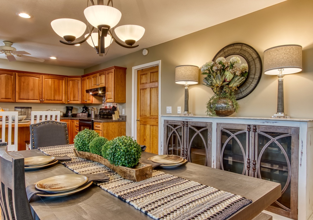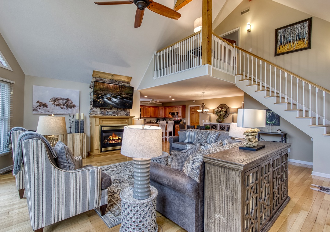 Stylishly furnished open-concept cabin with rustic-chic décor