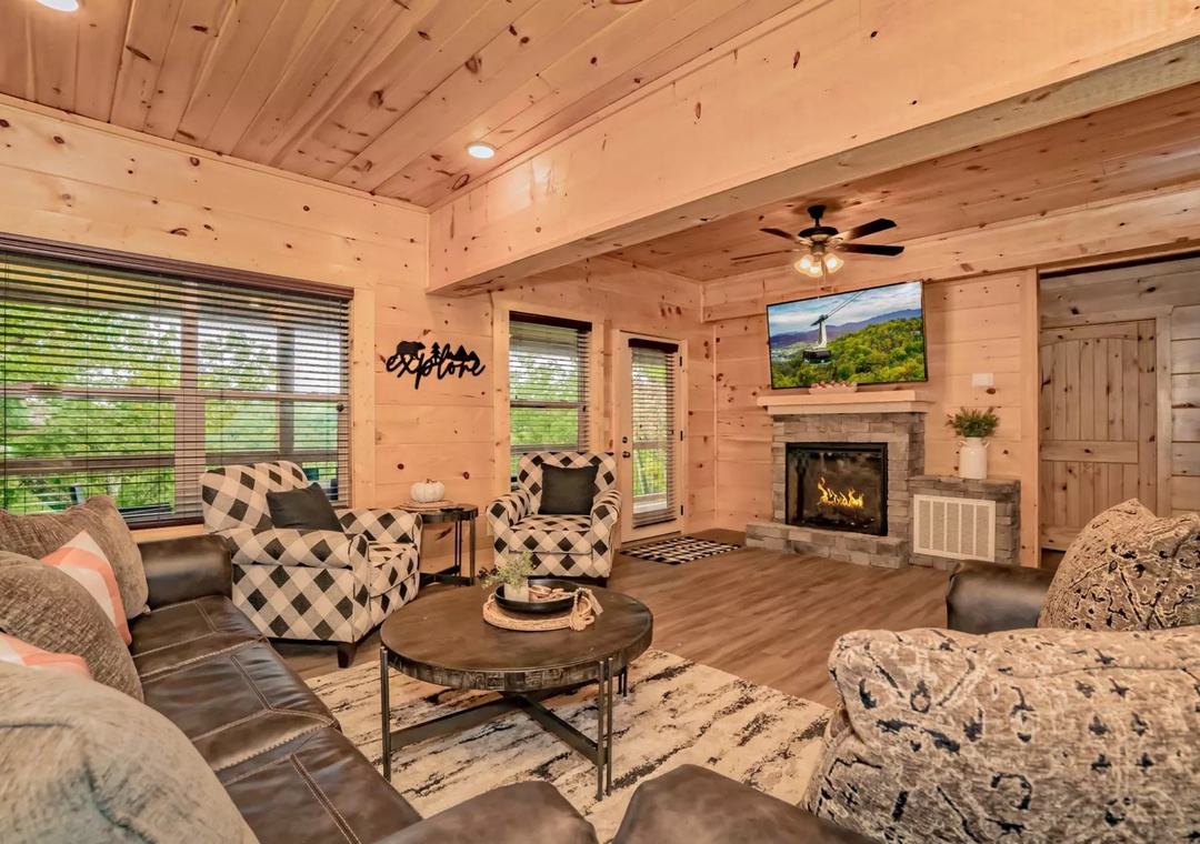 Living Area: Kick back on the leather sofa, enjoy the warmth of the electric fireplace, or watch your favorite shows on the HDTV. A sleeper sofa is available for extra guests.