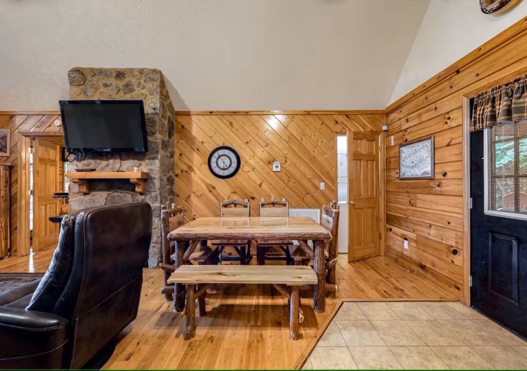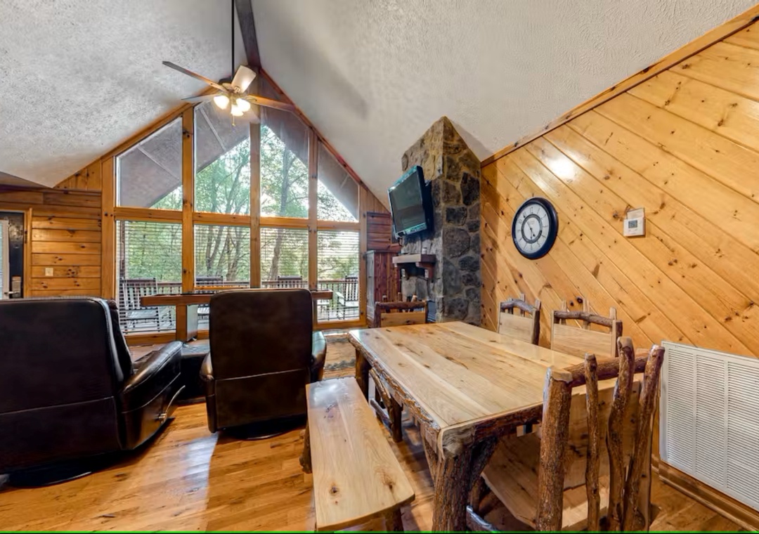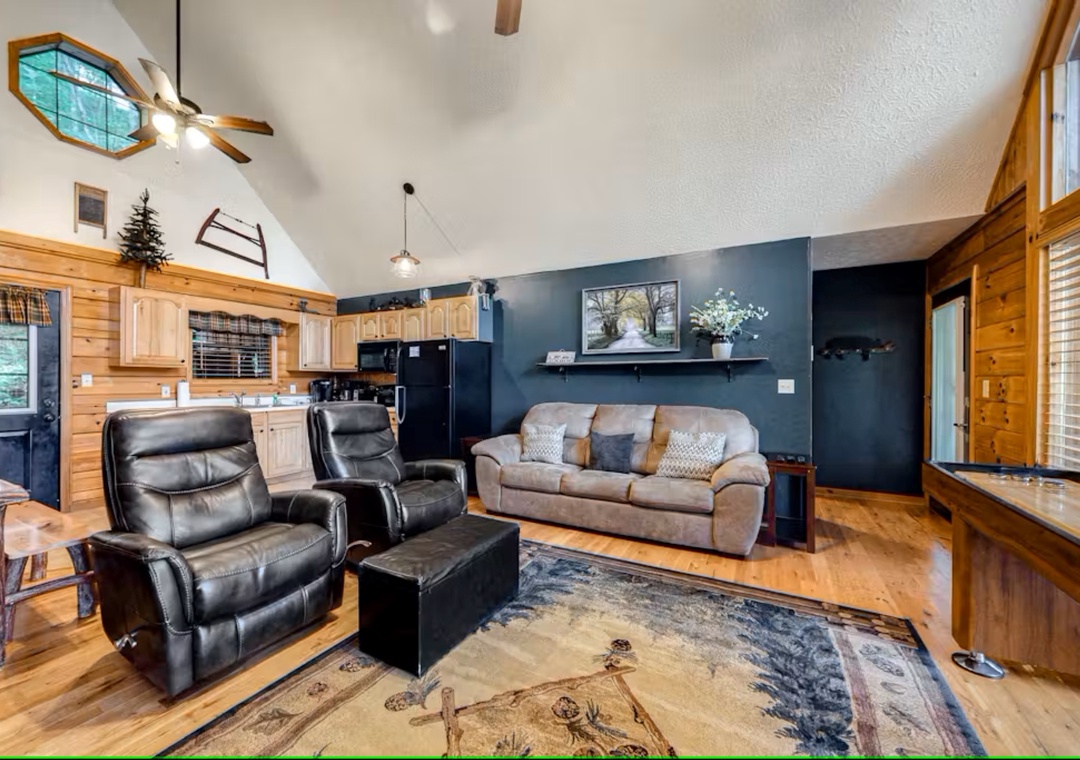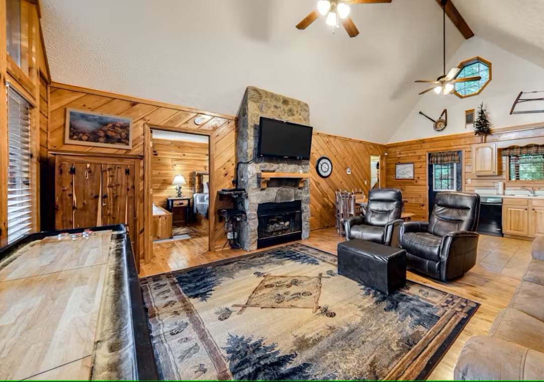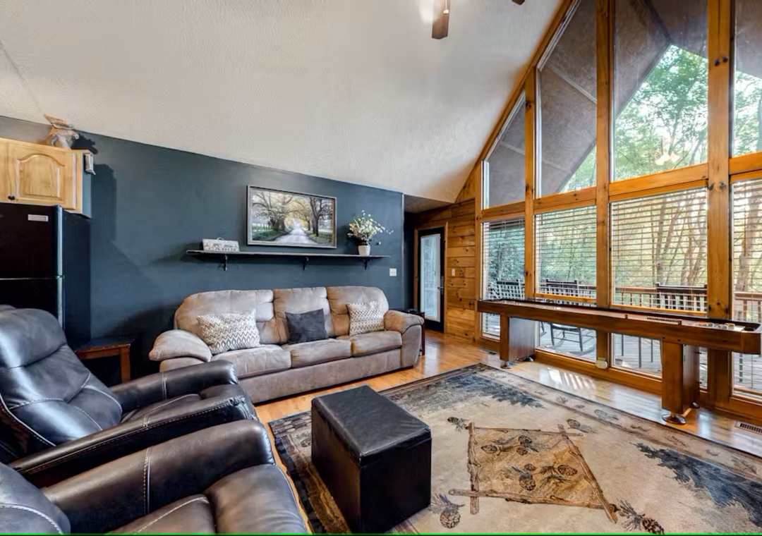 Enjoy peaceful mornings on the expansive front porch, complete with rocking chairs and a porch swing. Inside, you’ll find soaring ceilings, a cozy floor-to-ceiling fireplace, and a variety of entertainment options including a shuffleboard table and gaming console.
