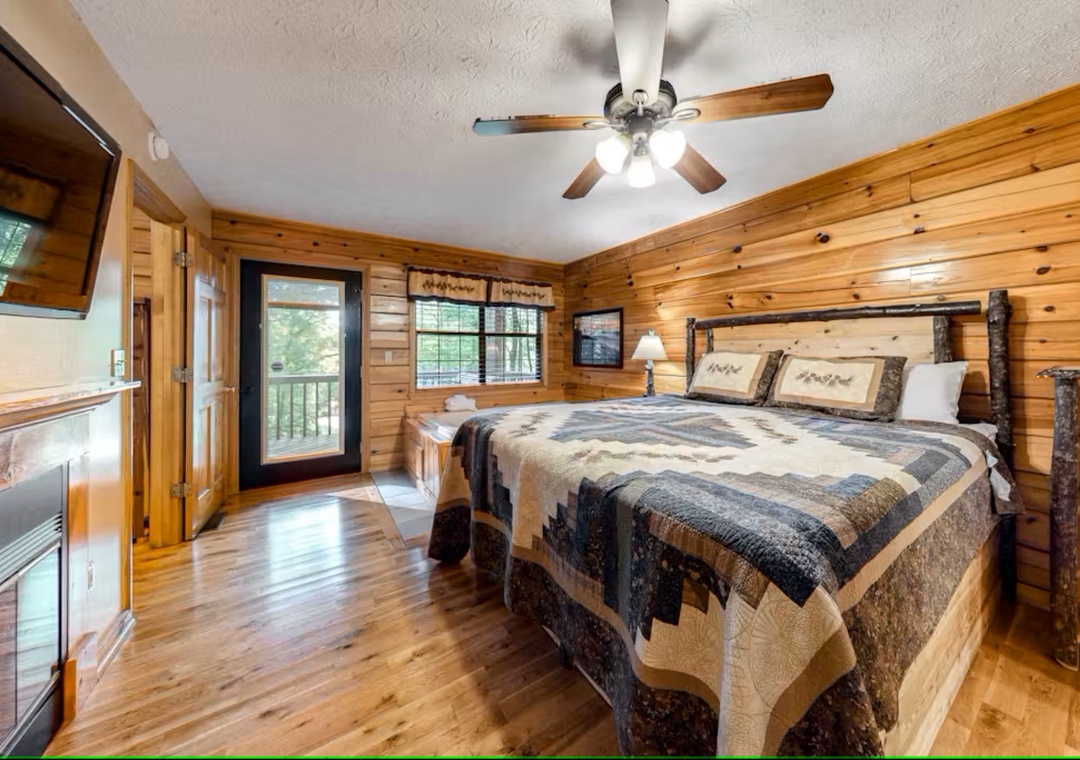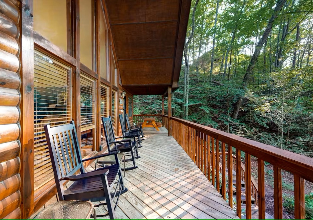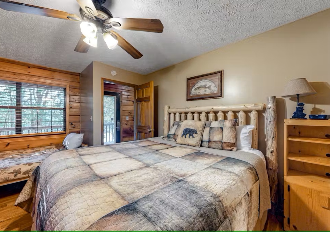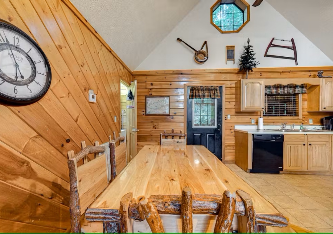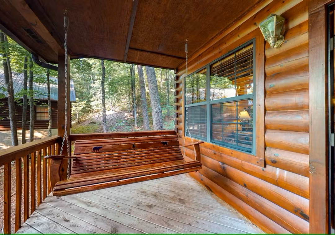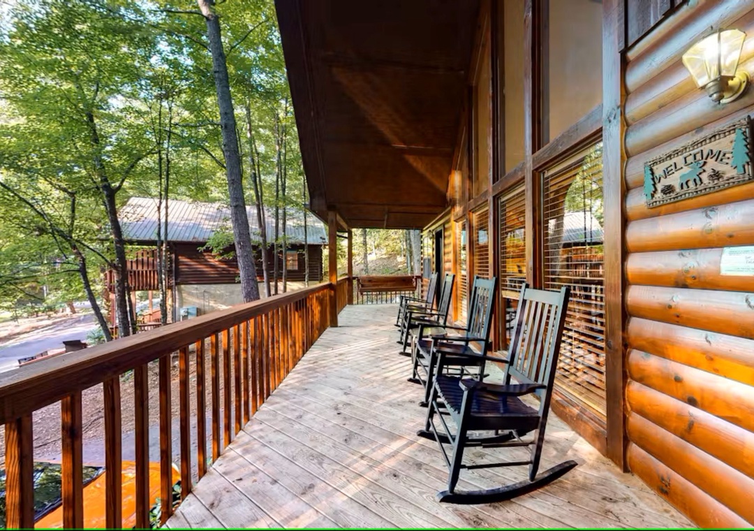 Enjoy peaceful mornings on the expansive front porch, complete with rocking chairs and a porch swing. Inside, you’ll find soaring ceilings, a cozy floor-to-ceiling fireplace, and a variety of entertainment options including a shuffleboard table and gaming console.