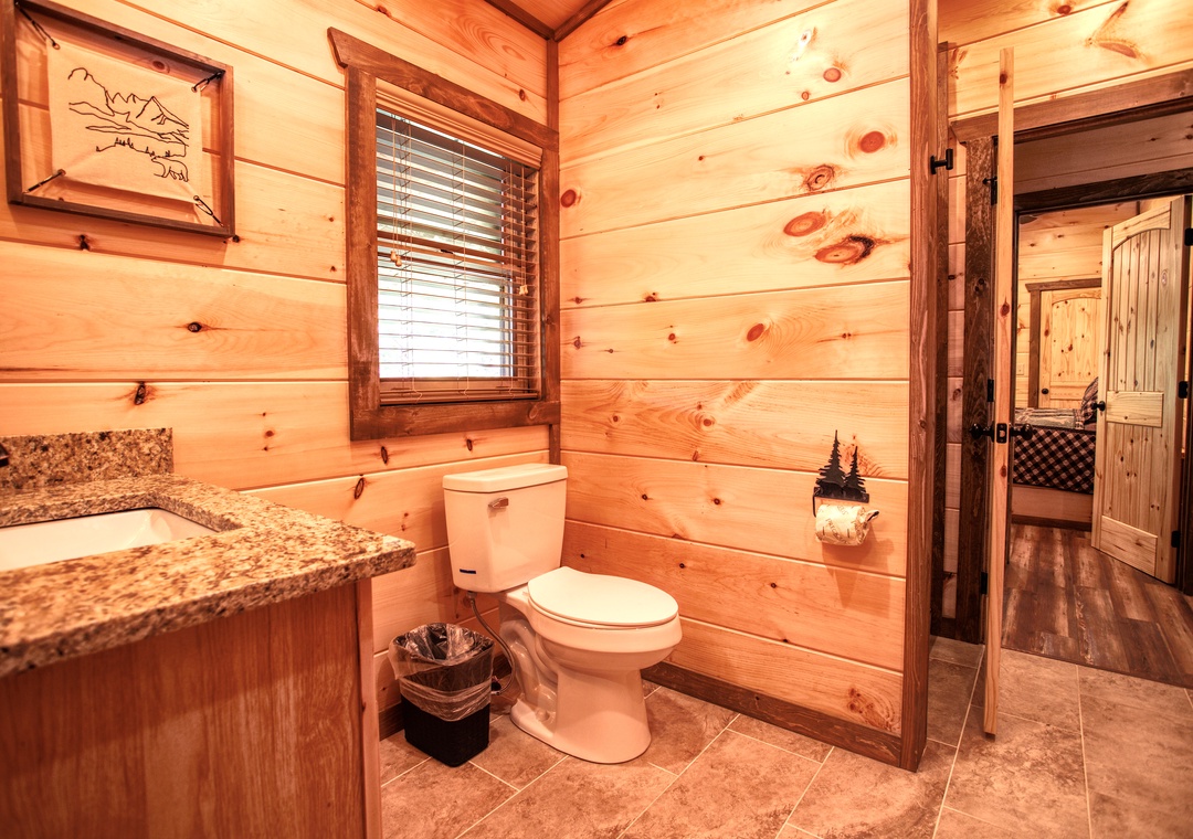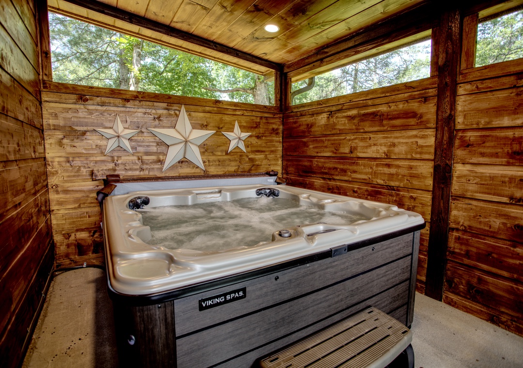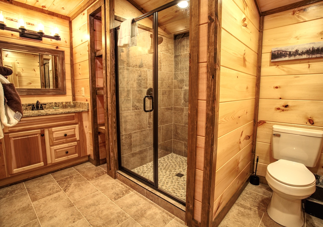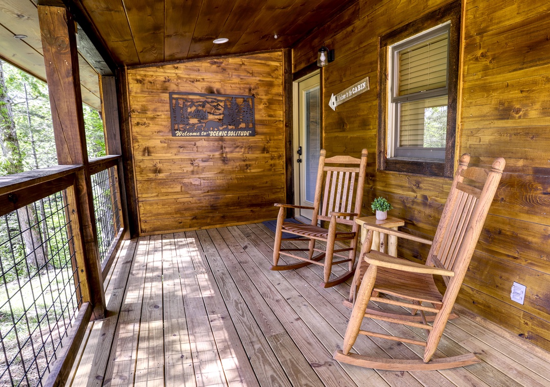 Scenic Solitude is a beautiful 2 bedroom, 3 full bath cabin conveniently located to all the area attractions – both Pigeon Forge and Gatlinburg. It’s located between the two favorites. Beautiful mountain and hillside views from both directions. Gorgeous granite countertops in kitchen and bathrooms; new interior/exterior siding and wood flooring throughout; all new furniture inside and out; and new porch decks and screened in areas around the cabin. Total living space is almost 2300 sq. ft. Three covered decks to take in the great outdoors no matter what the weather and we have all seasons in the Smoky Mountains so come prepared. DTV and flat screen TVs throughout. The flat driveway out front and new walkway from the driveway to the cabin makes getting in and out with luggage and the kiddos very quick and easy. There is plenty of parking for multiple vehicles. Entering the main level, you will want to head on out to the back porch deck to take in the view of English Mountain. The cabin sits on almost 1.5 acres accessed by a dead-end road, providing you with peace, quiet, privacy and seclusion. The beautiful stone and gas fireplace in the living room creates a warm and cozy atmosphere to enjoy while visiting the Smokies. October through April it will take the chill off the mountain evenings. There is plenty of seating to gather around and visit with family and friends, watch the 60” flat screen TV above the gas stone fireplace, or just relax with your favorite book. The sofa is also a sleeper for extra sleeping for the kiddos. Beautiful wood floors throughout! The kitchen is very spacious with a dining table for 6 and a large breakfast bar. Beautiful granite countertops, all new stainless steel appliances and brand new cabinets provide a wonderful place to cook with an abundance of storage. The kitchen offers everything you need to prepare large meals or quick snacks. And whether you’re cooking or sitting down to a meal, you’ll be able to enjoy the Mountain views through all of the large windows. But you don’t have to cook! Just enjoy! The King master suite is a great place to get a wonderful nights’ sleep so you’ll awaken refreshed and ready for the next day’s activities – whatever that may be. The new rustic furniture will make you feel right at home. It also has its’ own private screened deck area to take in the views while sipping your morning coffee. The dedicated master bath offers a beautifully tiled shower with plenty of space. 32” TV so can catch your favorite bedtime shown from the comfort of your bed. The second King size bedroom is located off the main living room. The new log furniture and comfy mattress were specifically chosen with your comfort in mind. If you need to join a Zoom meeting or do a little work during your visit, no problem! You’ll have high-speed Internet access and can work from the new log desk/chair. BUT you don’t have to work here. There is also a 55” TV available for your viewing pleasure. Down the brand new stairway to the newly added Theatre room. This room will not disappoint. Watch your favorite movie or sports game on a massive 85” TV with surround sound system. Small fridge for drinks and snacks. Sleeper sofa available for additional sleeping. The Hot tub area, also located on the lower level offers you privacy in a totally secluded, screened area to relax after that long day of hiking and exploring. This large hot tub accommodates 6-7 adults….sit back, soak and relax with friends while gazing at nature and the stars. The game room is separated from the cabin by about 25 steps – super convenient but allowing for lots of noise there that won’t disturb those inside the big house. Private game room boasts a 75” TV and surround sound system, pool table, air hockey table, 2 sleeper sofa, full size bar area, and full bathroom. Plent1 of room for the kids to get away from the adults and have fun — or for the “big kids” to hang out and enjoy themselves! This will be someone’s favorite spot for sure. Go ahead – hang out, binge watch, snack to your heart’s content, be competitive – it’s your vacation. Do what you really want to do. A large fire pit area is nestled in-between the game room and main cabin. Here you can stargaze, roast marshmallows, have a weenie roast and tell tall tales. Perhaps you’ll be able to solve the political problems of the day. Or just relax and smell the fresh mountain air, this is a special place and it’s all yours for your stay. Enjoy! Over 2200 Square feet of fabulous vacationing space – all for you. You should probably Book NOW!! Beds: Main Floor – King Master Suite; King size bedroom and hall bath; Lower level – 2 Queen Sleeper Sofas in Theatre room, Recreation Room