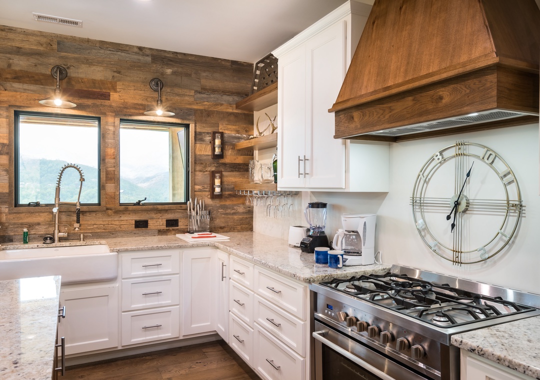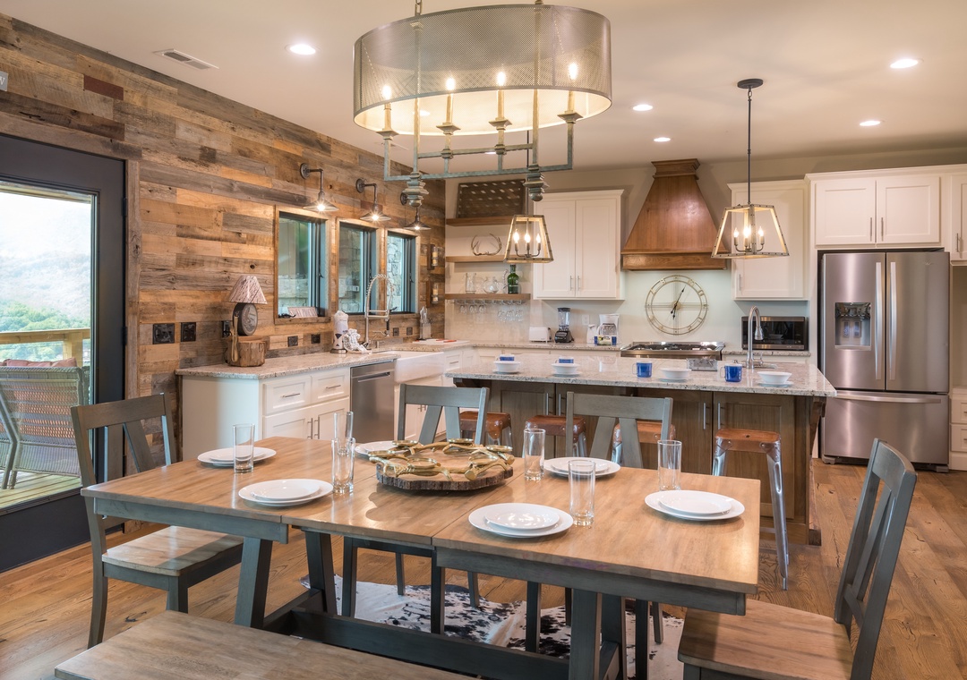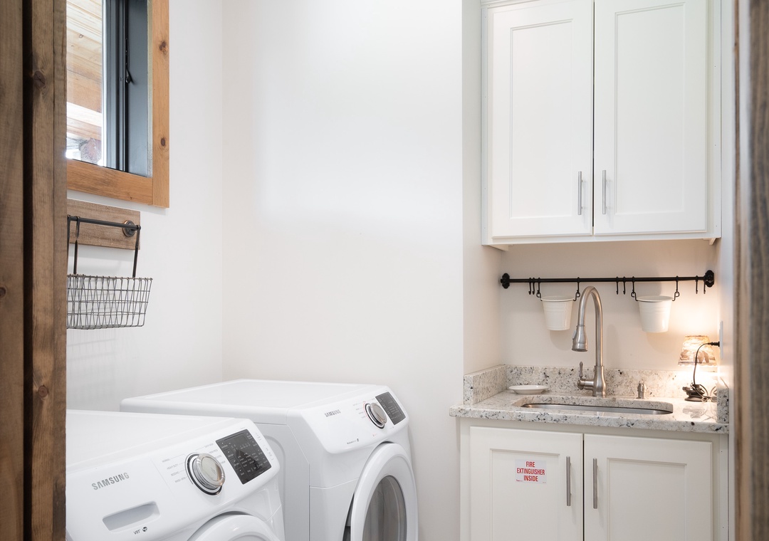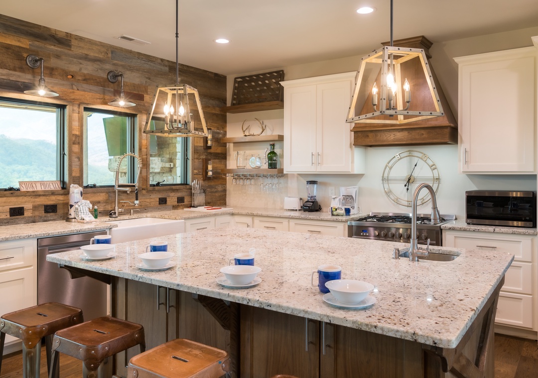 Let’s start in the modern, bright kitchen which has everything you need to prepare a 4 course meal or enjoy a quick breakfast before you head out for the day. Beautiful and functional – everyone will enjoy hanging out and eating in the kitchen at Smoky Mountain High. Laundry room is located just off the kitchen.
