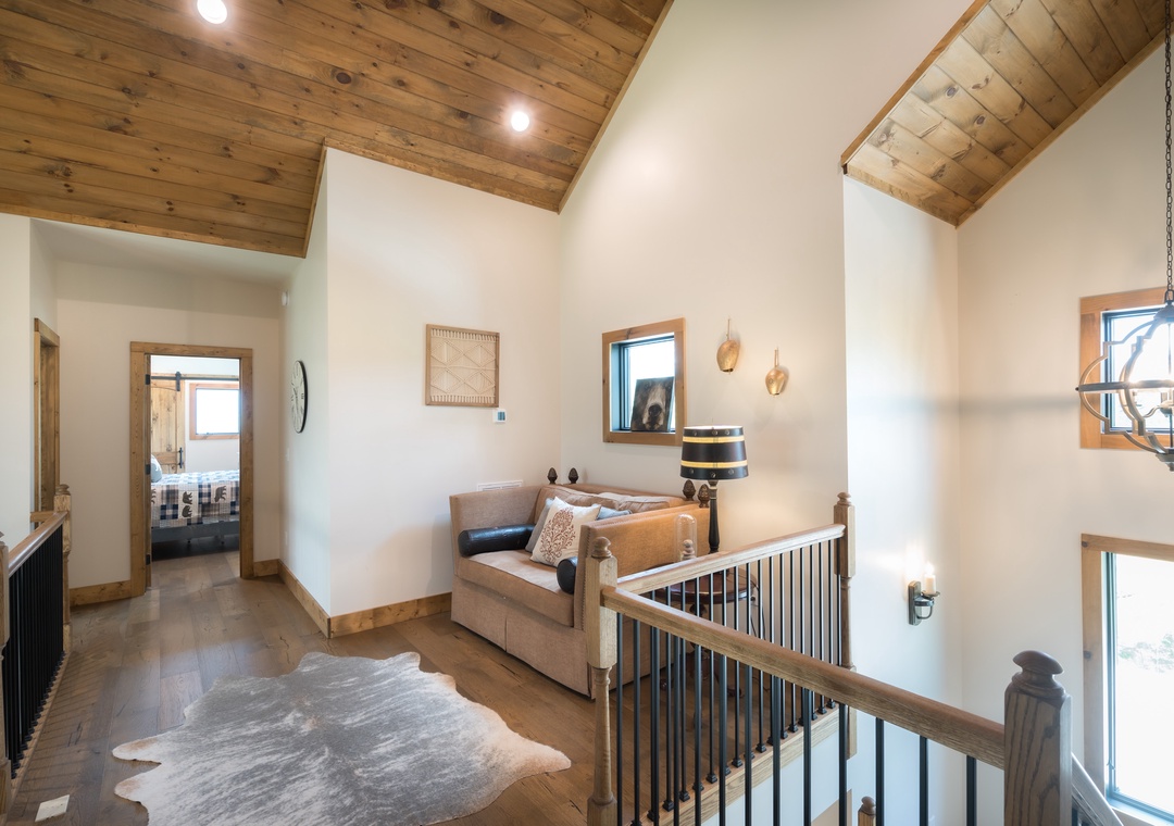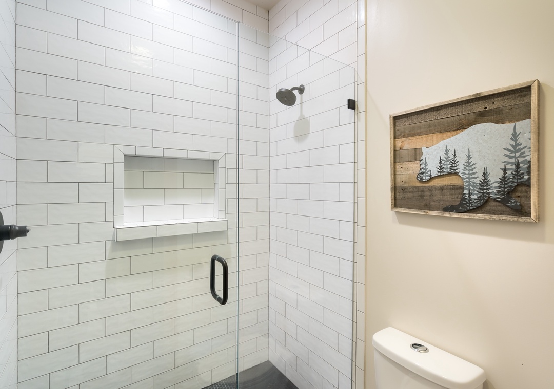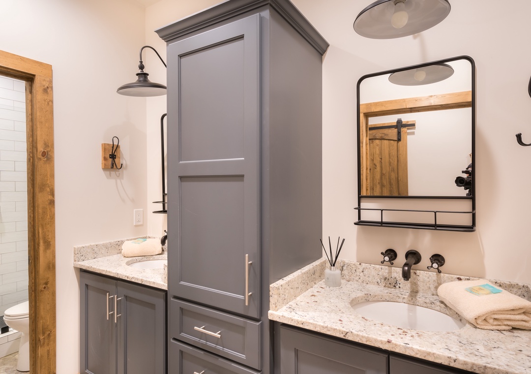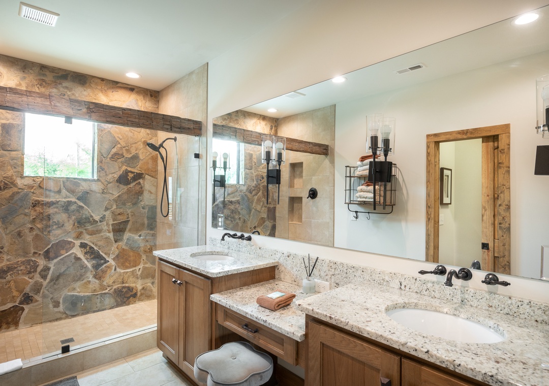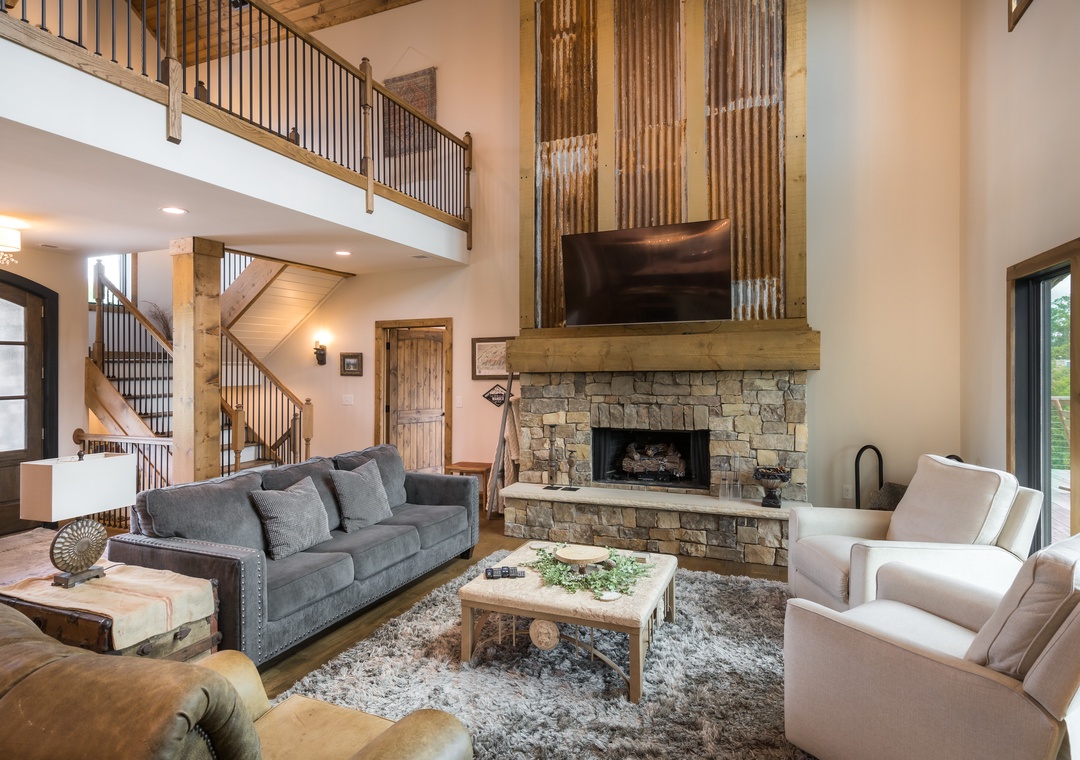 Upstairs are two separate Queen bedrooms that share a unique jack and jill bathroom. Both sides have their own sink and toilet, but share a large shower in between for extra privacy. Beautifully furnished with your comfort and “experience” in mind. Enjoy Tennessee sleeping and awake refreshed and ready to go the next day.
