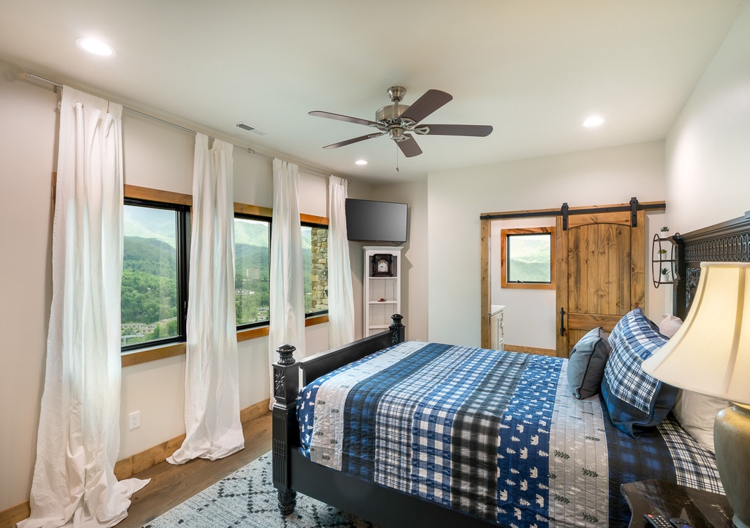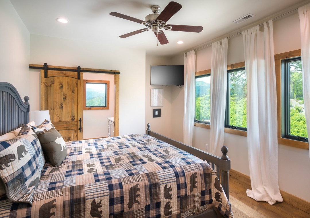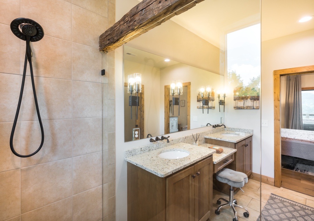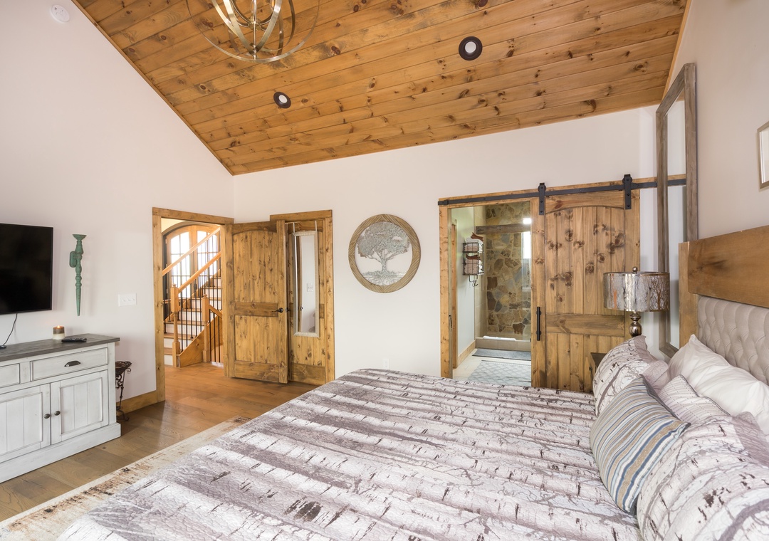 King master suite on the main floor with gorgeous views and access to the deck. Large walk in stone shower is a terrific experience in this beautiful, private vacation home. Beautifully decorated and furnished with comfy king bed so you get a great night’s sleep.