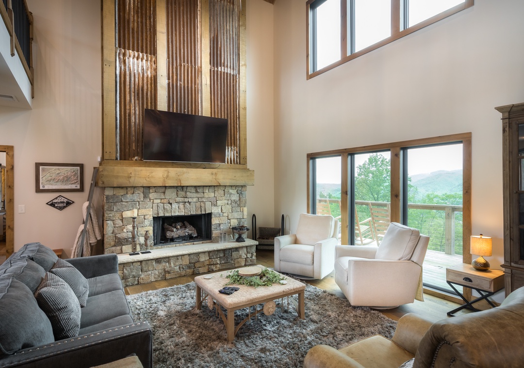Living room with floor to ceiling windows to enjoy the views from morning til night and then the lights of the city after dark – spectacular! Large screen tv with plenty of seating to gather around and watch a movie together. Or curl up in front of the fireplace with a great book.