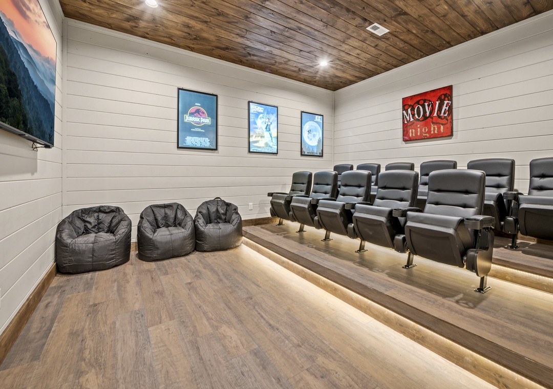 The large living room area has an electric fireplace to take the chill off those mountain evenings and provide just the right warmth for your morning coffee. With a large smart TV along with the comfy furniture, it's the perfect space to gather for a movie night or to cozy up and read a book. Speaking of movie night, head down to the lower level where you'll find a theater room with 11 comfortable chairs to relax in as well as a game room with arcade games and a pool table. Right off the entertainment area is the enclosed swimming pool area with a heated adult pool and kiddie pool that you can see right into with large windows separating the two areas so you can keep an eye on the kids. And that's not it – there's also a hot tub on the deck so you can let the steam rejuvenate your body after a day of hiking and exploring all that this beautiful mountain town has to offer! The five King suites all include a futon bed, private bathroom, mini fridge and Keurig so you have a private sanctuary even while vacationing with a big group. The large bunk room that sleeps 12 is perfect for all the kids. Splash Villa truly has it all and will surely be the place your family comes back to make lasting memories year after year.