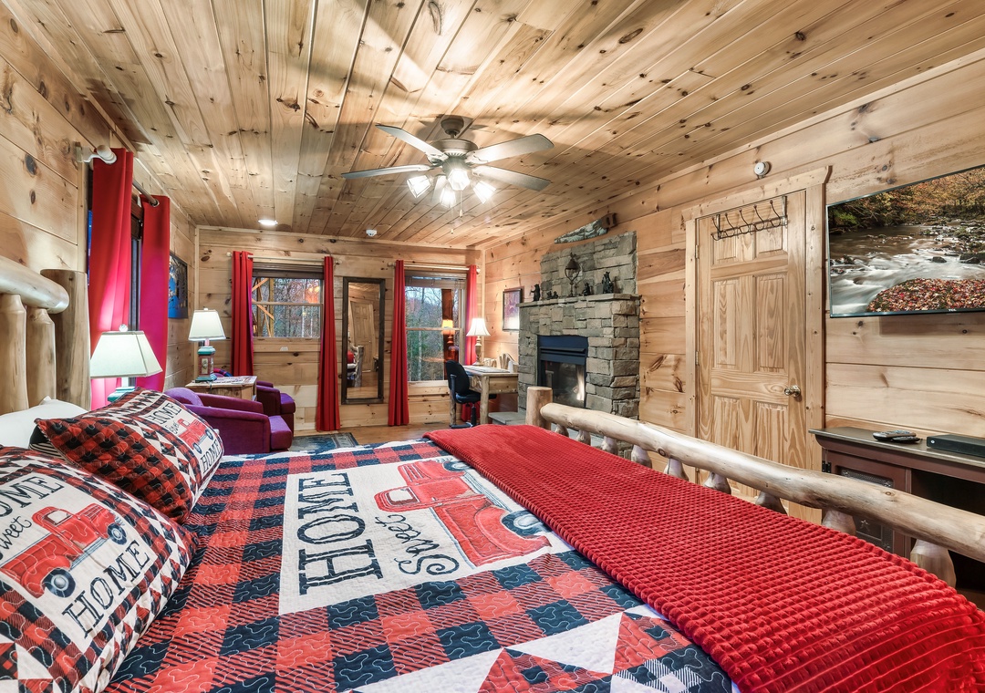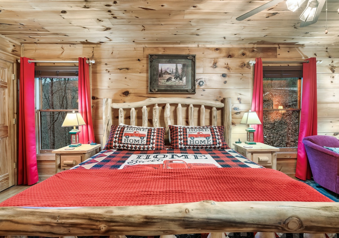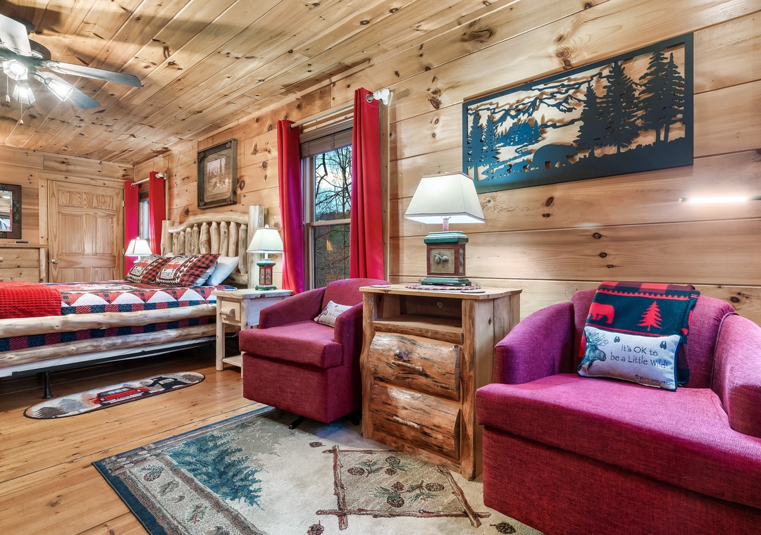 The main-floor master bedroom features a luxurious king-size bed, private en-suite bathroom, and a cozy view of the double-sided fireplace — perfect for unwinding after a soak in the hot tub. Upstairs, the second bedroom offers another comfortable king bed and easy access to a full bathroom, making it ideal for a second couple or kids needing their own space.