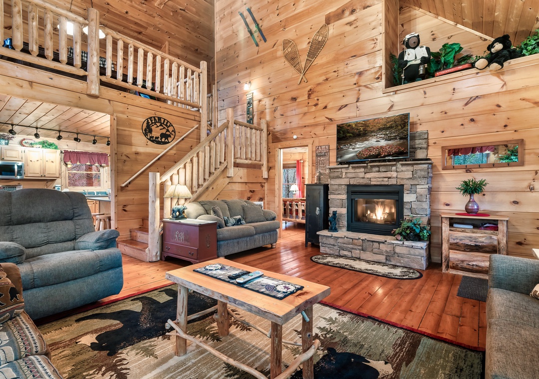 Step inside and you’re welcomed by soaring ceilings, large windows, and the inviting glow of a two-way gas fireplace that connects the open living area to the main-floor master suite. The living room features a 65-inch Smart TV and plush seating — ideal for movie nights or curling up after a day in the mountains. Natural light pours in, illuminating the rustic wood interior and creating a peaceful ambiance throughout.